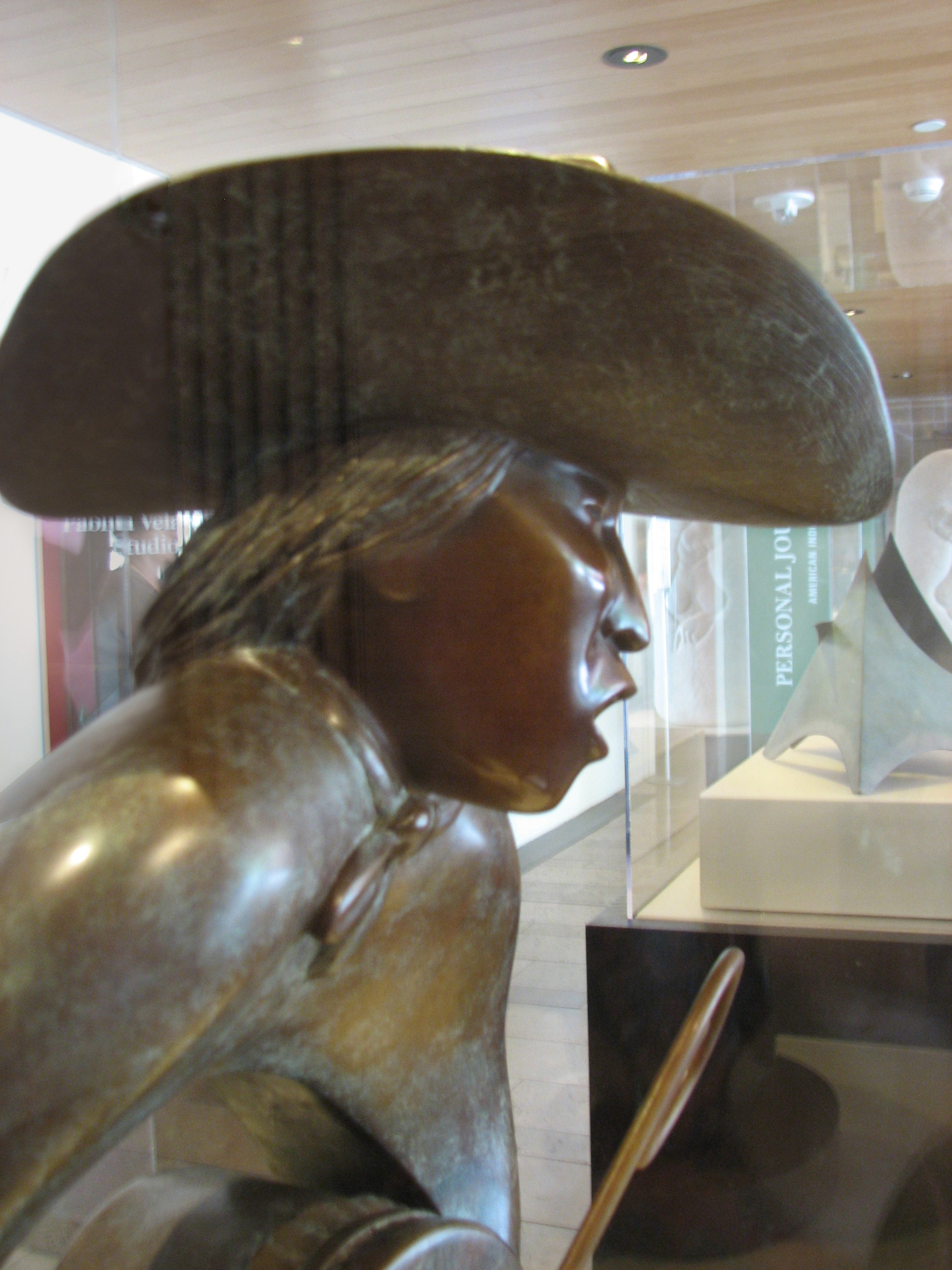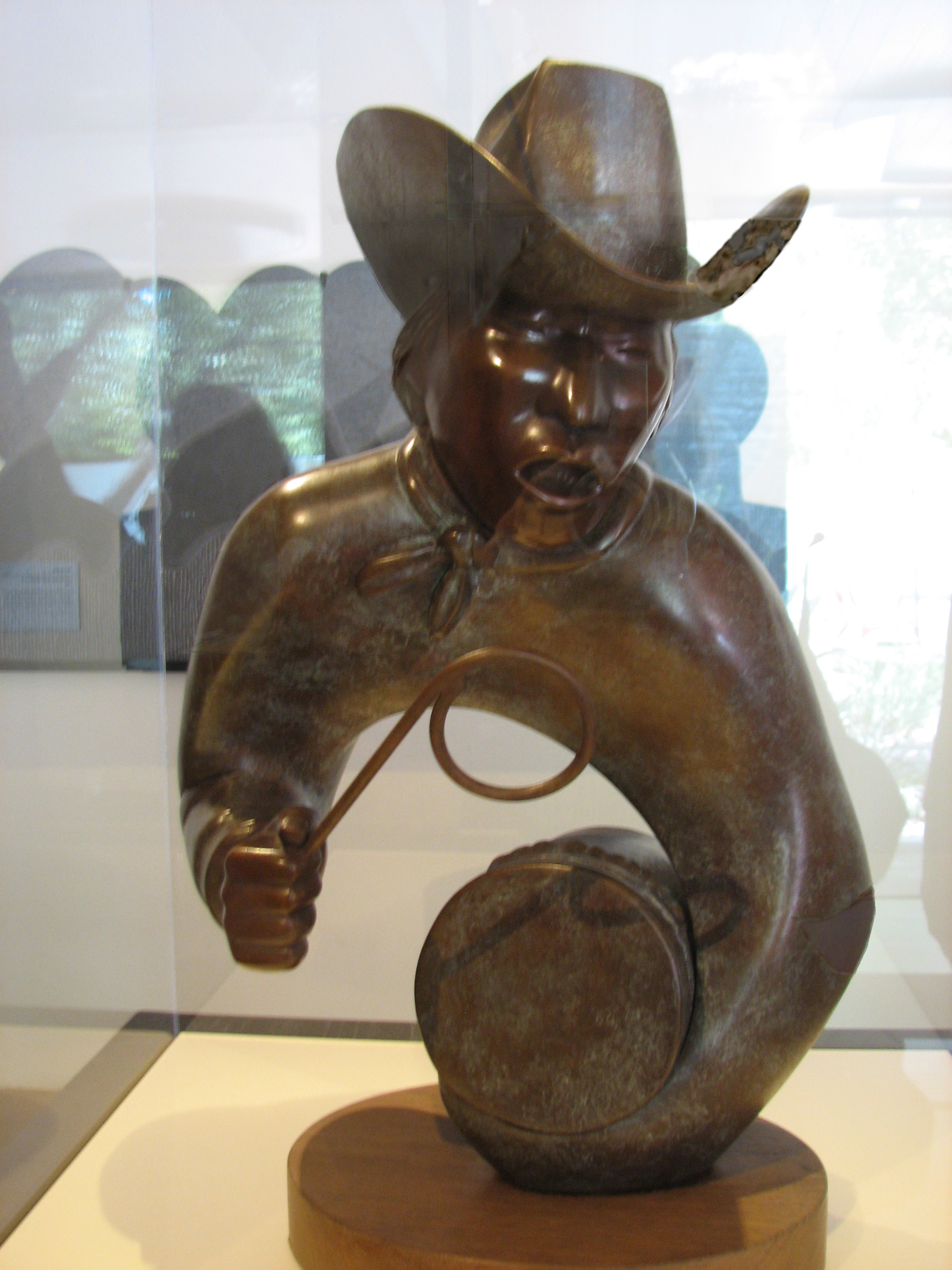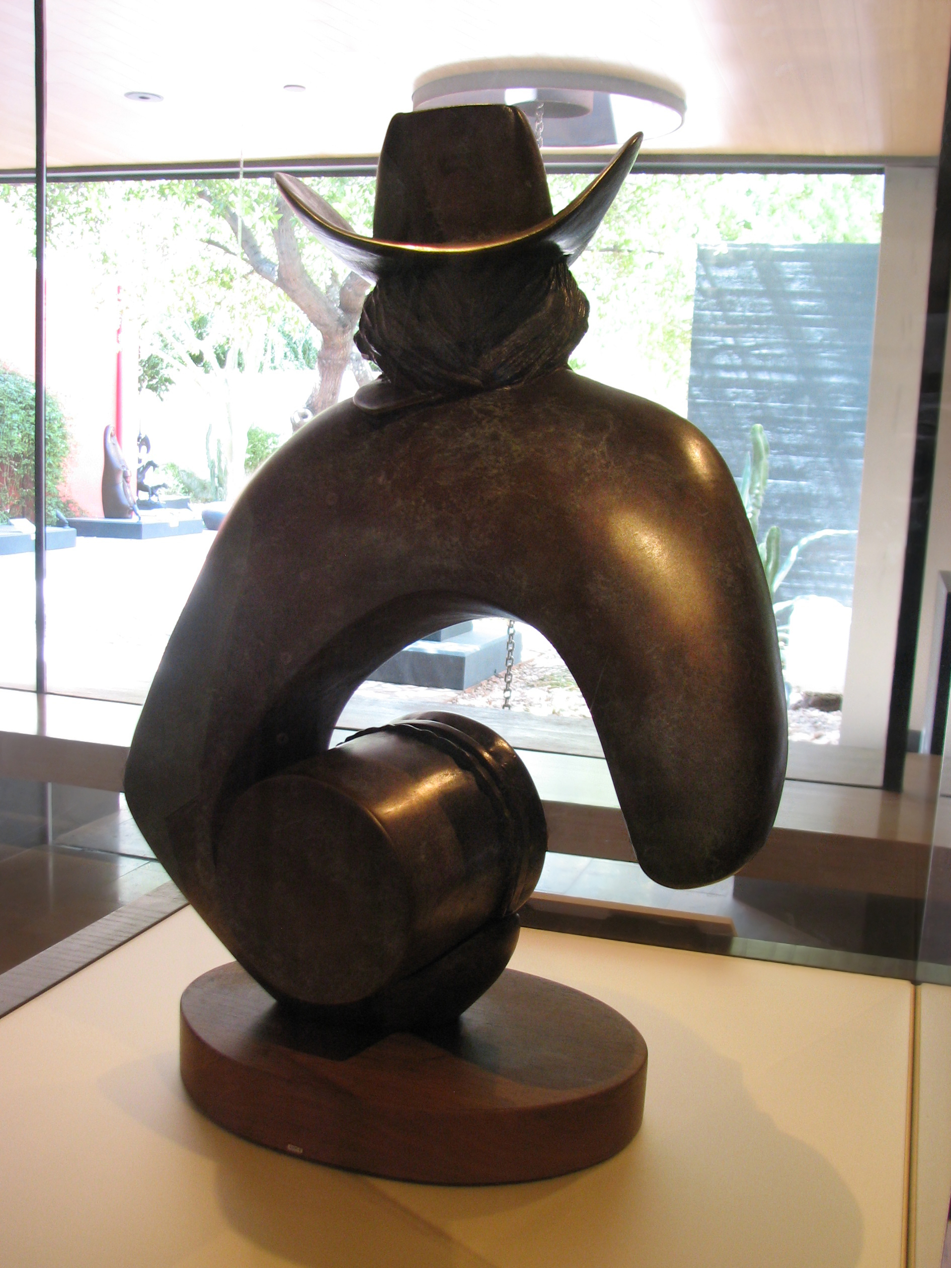 "The artist regularly attended the Fourth of July feast days in Mescalero, New Mexico, where he would see the Mountain Spirit dances and Mescalero singers. In turn, the Mescalero dance groups and singers attended the annual October gathering in Oklahoma. This sculpture, using a minimalist approach, captures the essence of a singer, with open mouth, hoop drumstick and the round top of the drum echoed by the circle of arms." (Info Card)