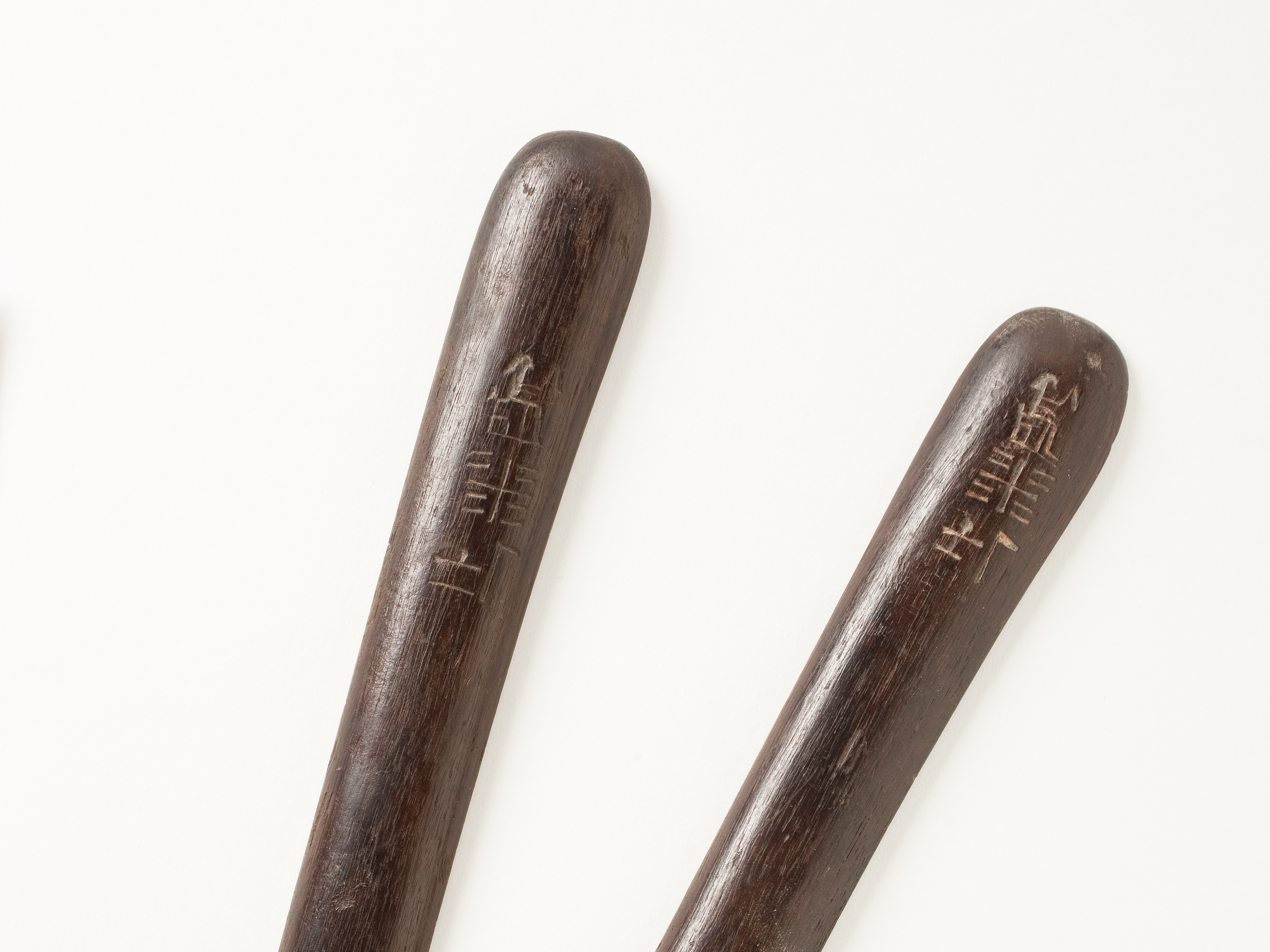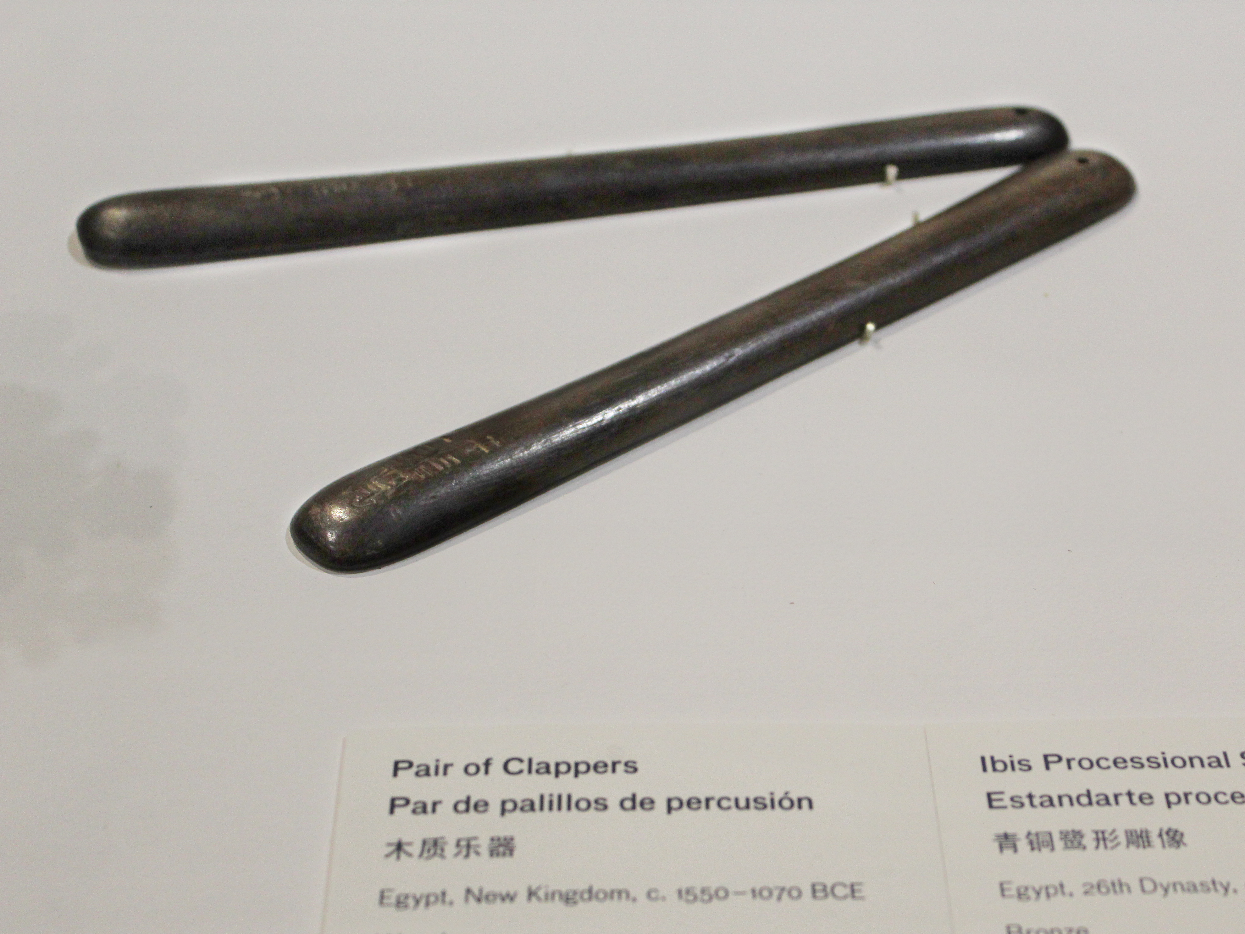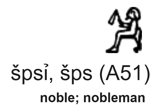 ![]() Wood, each: 9 13/16 × 1 1/16 × 1/4 in. (24.92 × 2.7 × 0.64 cm) Gift of Jerome F. Snyder LACMA #M.80.202.165a-b My photo barely shows the holes at one end and the glyphs. This crop of the museum photo shows the glyphs more clearly: ![]() We can recognize the glyphs for "noble", "shepsi" (Gardiner A52): ![]() The "flag" glyph means "netjer" ("god"), and there's part of the "hotep" glyphs. Perhaps there's the meaning of making music to please the gods? |