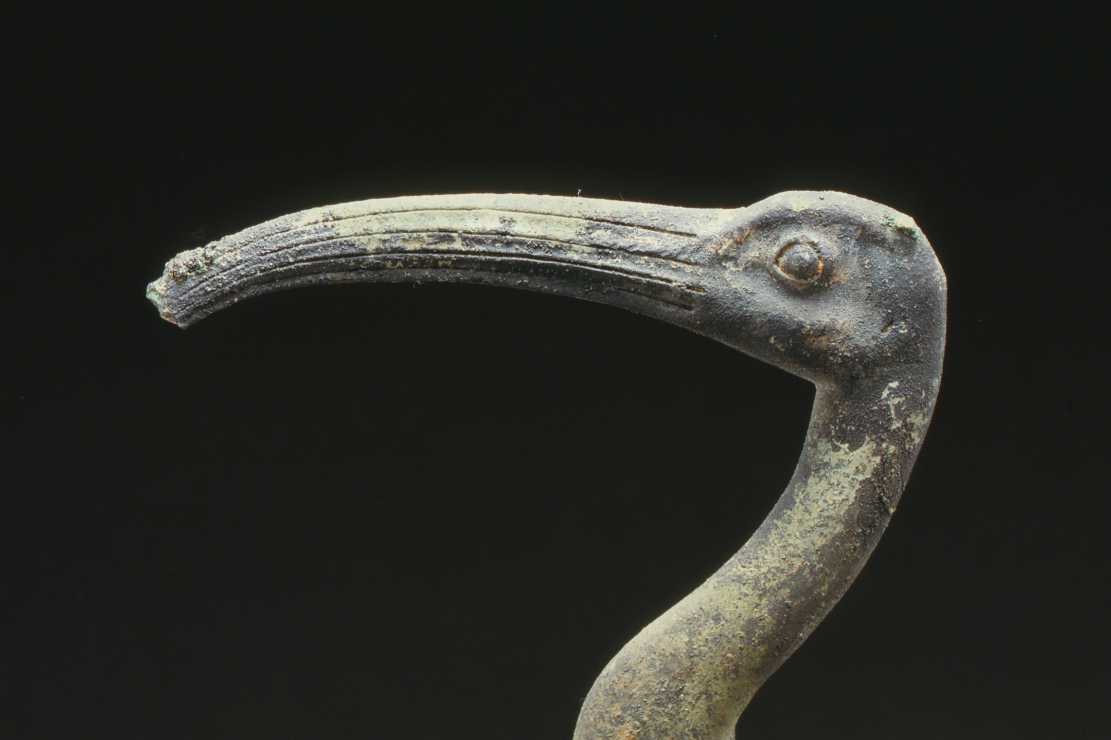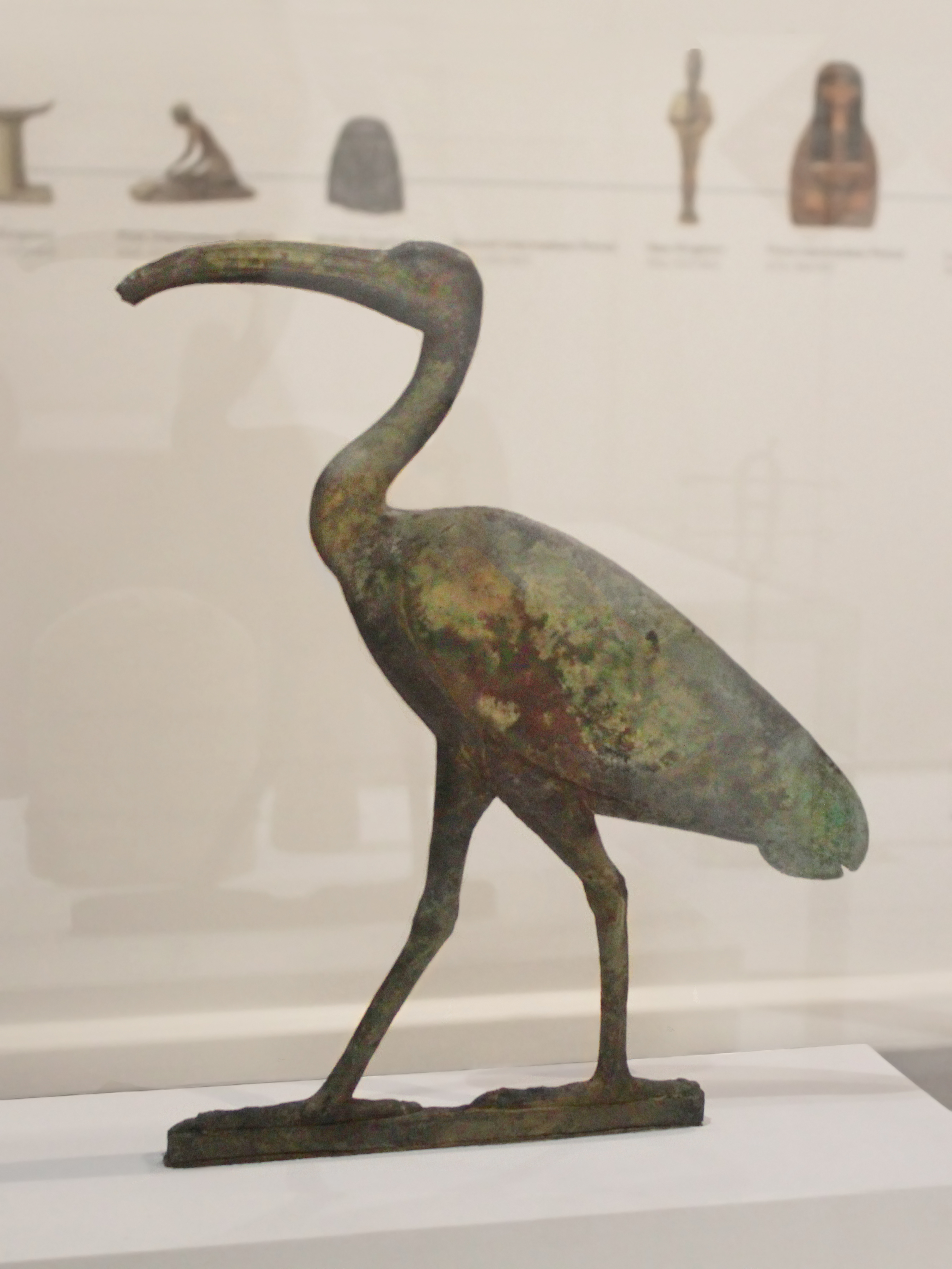 "This ibis image was probably attached to a staff in order to create a standard (a type of banner) that would have been carried by priests or government officials in religious processions or parades. Very few examples of processional standards survive, although their importance in public processions is demonstrated in illustrations on Egyptian monuments and sculpture. This standard dates to the Late Period (712 - 332 BC). Although the standard seems flat, it was designed as a three-dimensional object. The skill of the artist who created this bronze is evident in the elegance of the outline and contour and the attention to detail. Late Period bronze production reached its peak during the Twenty-sixth Dynasty (664 - 525 BC), a likely date for this object." (From the Curator notes) My photo fails to show the details, but a crop of the museum photo shows the fine details in the ibis' head: