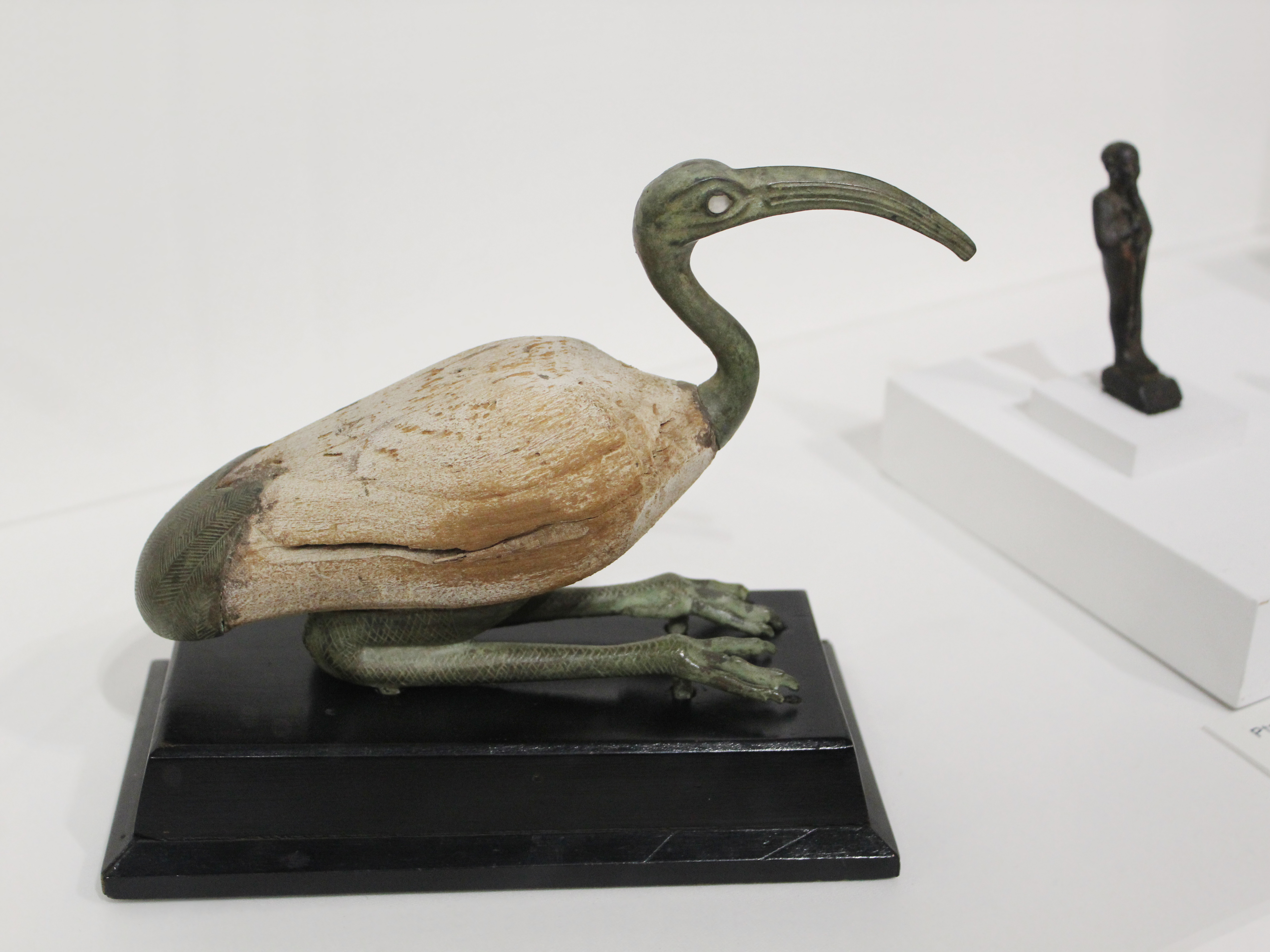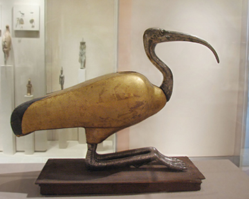 ![]() Wood and bronze, 5 1/2 × 8 11/16 × 2 in. (13.97 × 22.07 × 5.08 cm) Gift of Varya and Hans Cohn LACMA #AC1992.152.58 The Brooklyn museum has a similar piece: ![]() Their piece is described as an "ibis coffin". "Animal remains" are listed as part of its elements. LACMA's piece is only composed of wood and bronze. If it lacks a cavity for such remains, this piece only exists to represent the god Thoth (aka Djehuty). "In the form of the sacred ibis (Threskiornis aethiopicus), whose distinctive white surrounded by black plumage and crescent-curved bill may have held symbolic significance. Thoth was depicted in many statuettes which represent the god in general without suggesting a specific lunar or scribal aspect. The ibis may be depicted standing or sitting, and a depiction of the bird perched on a standard was the usual image used to write the god's name." (Richard Wilkinson, _The Complete Gods and Goddesses of Ancient Egypt_, (Thames and Hudson, 2003), page 217) |