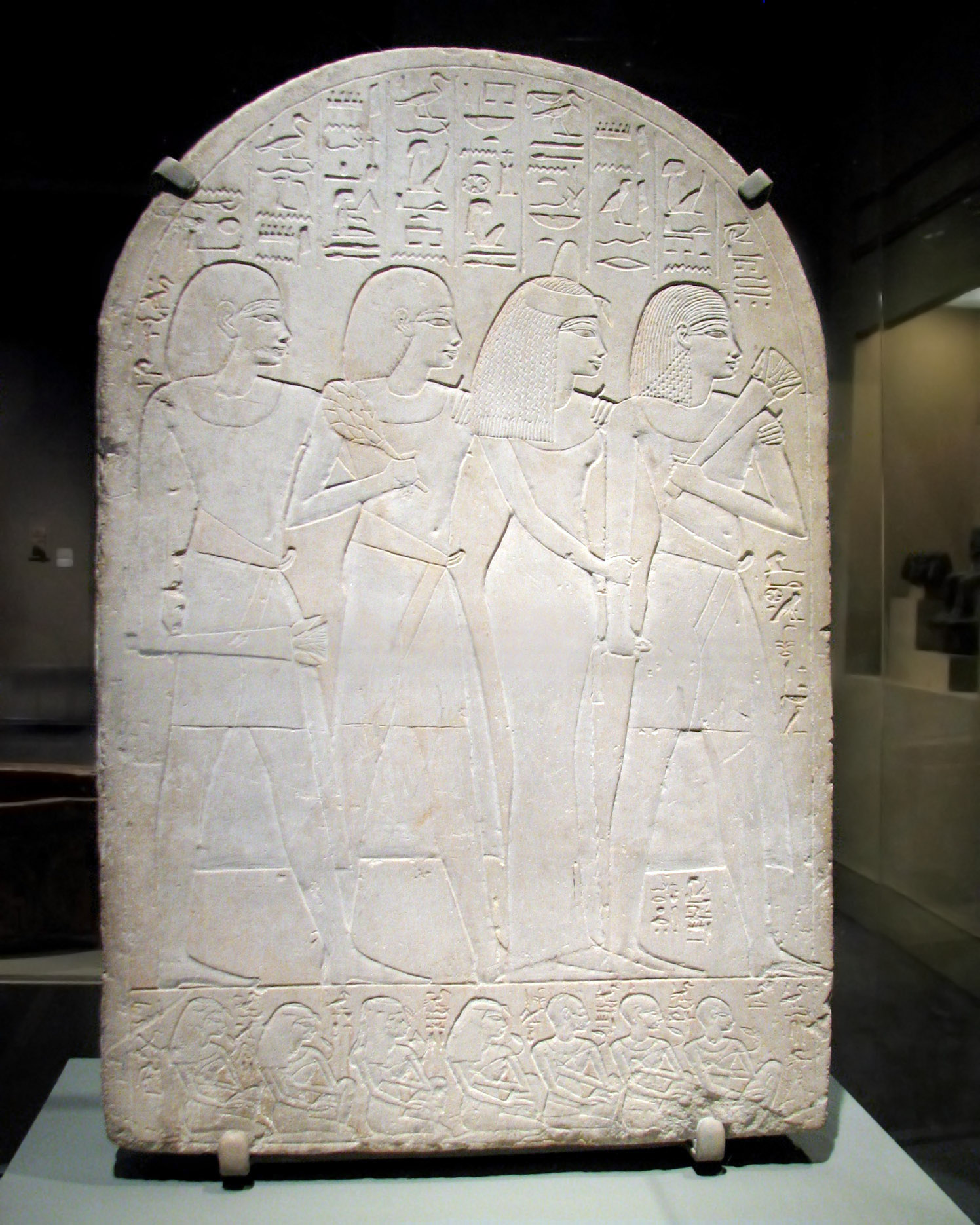 (From the info card) "Iuf-er-bak, a noble from the Egyptian capital city of Thebes, stands at the right accompanied by his wife and two sons. The men carry floral funerary offerings, while in the register below, seven relatives are seated at a funerary banquet. Iuf-er-back is identified by his name and titles inscribed above his head as the 'guardian of the storehouse of the Temple of Amun,' while his wife is described as 'Nebut-iunet, mistress of the house.' "The stela is carved in the extremely delicate, refined style of the Mid-eighteenth Dynasty, specifically that of the reign of Amenhotep III, considered to mark the apex of Egyptian artistic production. Hallmarks of this tradition can be seen in the finely detailed facial features, the elongated proportions of the figures, and the careful rendering of the transparent garments."