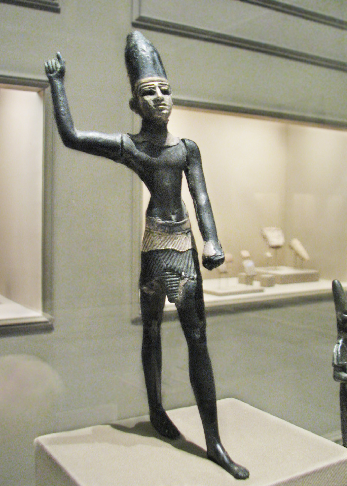 "The Glyptotek Seth's pose recalls more closely representations of foreign gods as warriors, with right arm raised, and the established relationship between the god Seth and Canaanite gods such as Baal and Reshef may provide clues leading to a better understanding of the figure. Metal statuettes of these deities were produced in the Levant during the Late Bronze Age, beginning around 1500 BC. Based on the observation that such deities, unlike kings, were not shown grasping prisoners, Izak Cornelius replaced the term smiting god, which proceeds from 'smiting pharoah', with menacing god, and he suggests that the images conceptualize power by virtue of the gods' raised right arms, even if they do not hold a weapon." (From _Seth, 'Figure of Mystery'_, by Deborah Schorsch and Mark T. Wypyski in JARCE 45 (2009) page 186)