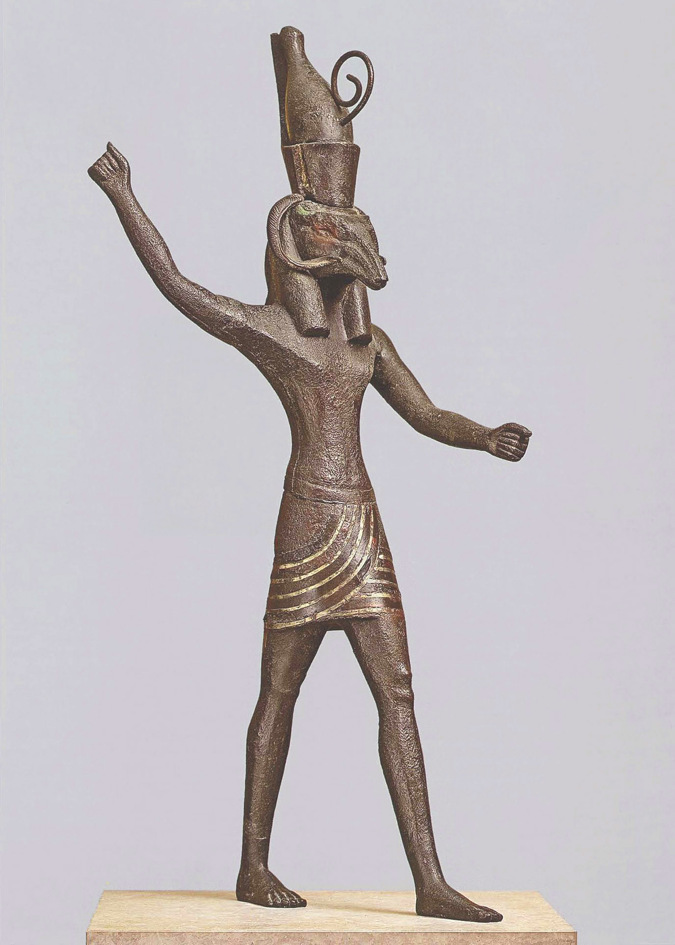 New Kingdom, 19th-20th Dynasty (ca. 1295-1070 B.C.) Unalloyed copper, solid cast, with separate right arm; auriferus silver and copper alloy inlay; partially clad with gold sheet; altered in antiquity by removal of ears and addition of ram horns and crown with lituus; feet with lower legs, right horn, and reattachment of right arm are 19th-century restorations. H. as restored 67.7 cm (26 5/8in.), W 35 cm (13 3/4in.), D. 30cm (11 3/4in.) Ny Carlsberg Glyptotek, Copenhagen MEIN 614) Scanned and quoted from _Gifts for the Gods:Images from Egyptian Temples_, pages 34-37 Edited by Marsha Hill and Deborah Schorsch, published in conjunction with the exhibition “Gifts for the Gods: Images from Egyptian Temples” at The Metropolitan Museum of Art, New York, October 16, 2007–February 18, 2008. |