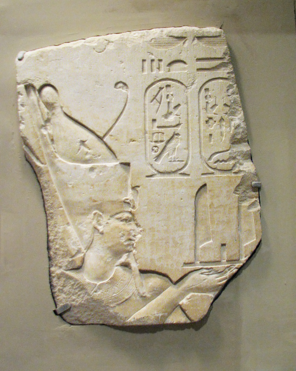 (From the info card) "The king wears the double crown of Upper and Lower Egypt. Two of his official names, the nomen and prenomen (Senedjemibre' Setepenanhur), are inscribed in cartouches on this fragment." |