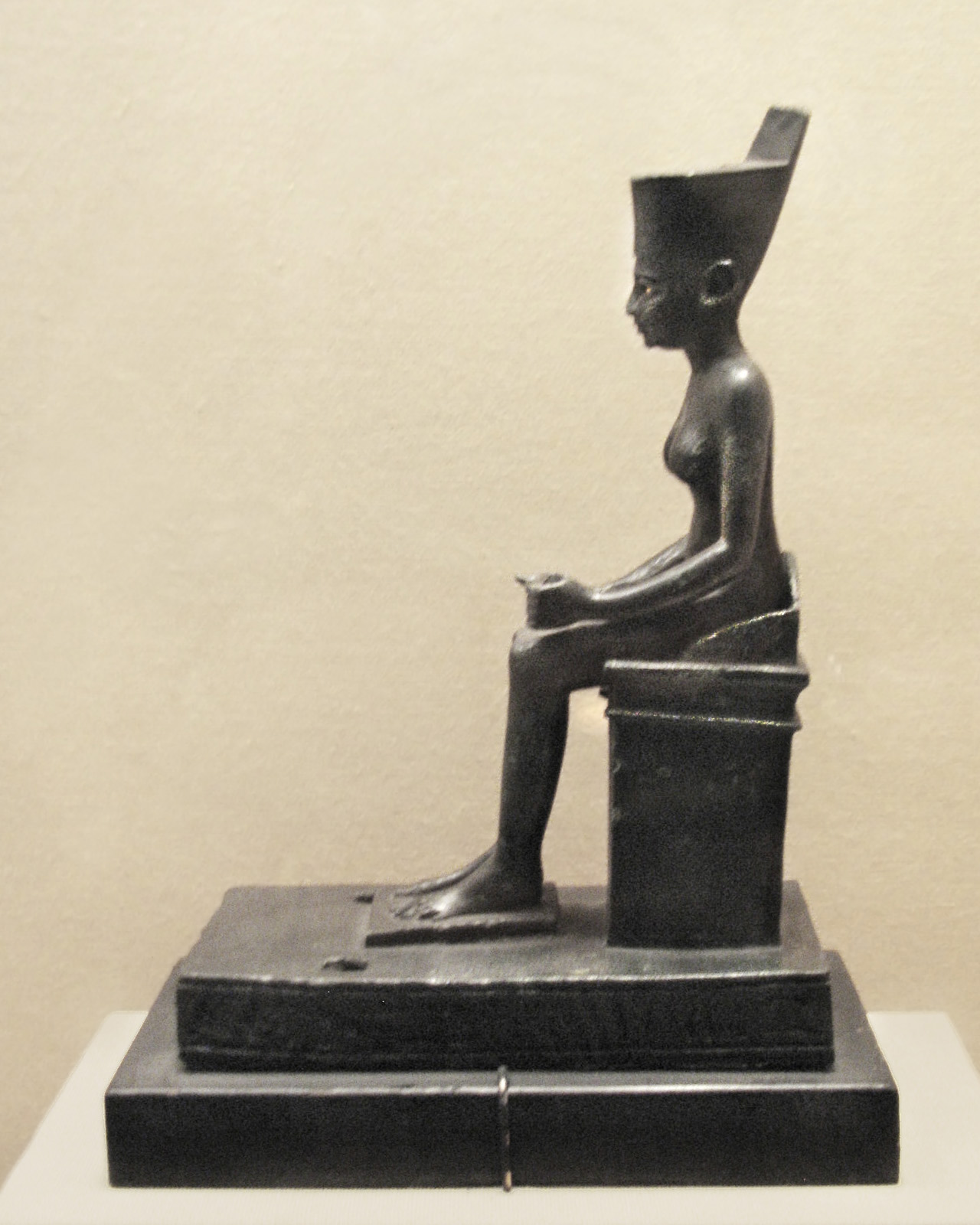 "The primeval goddess Neith is represented in female form wearing the “red” crown of Lower Egypt. As goddess of war, she served as one of the protectors of the king and had cult centers in the ancient Egyptian cities of Sais and Esna."
