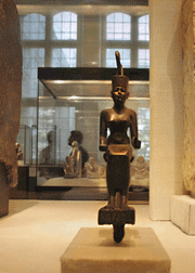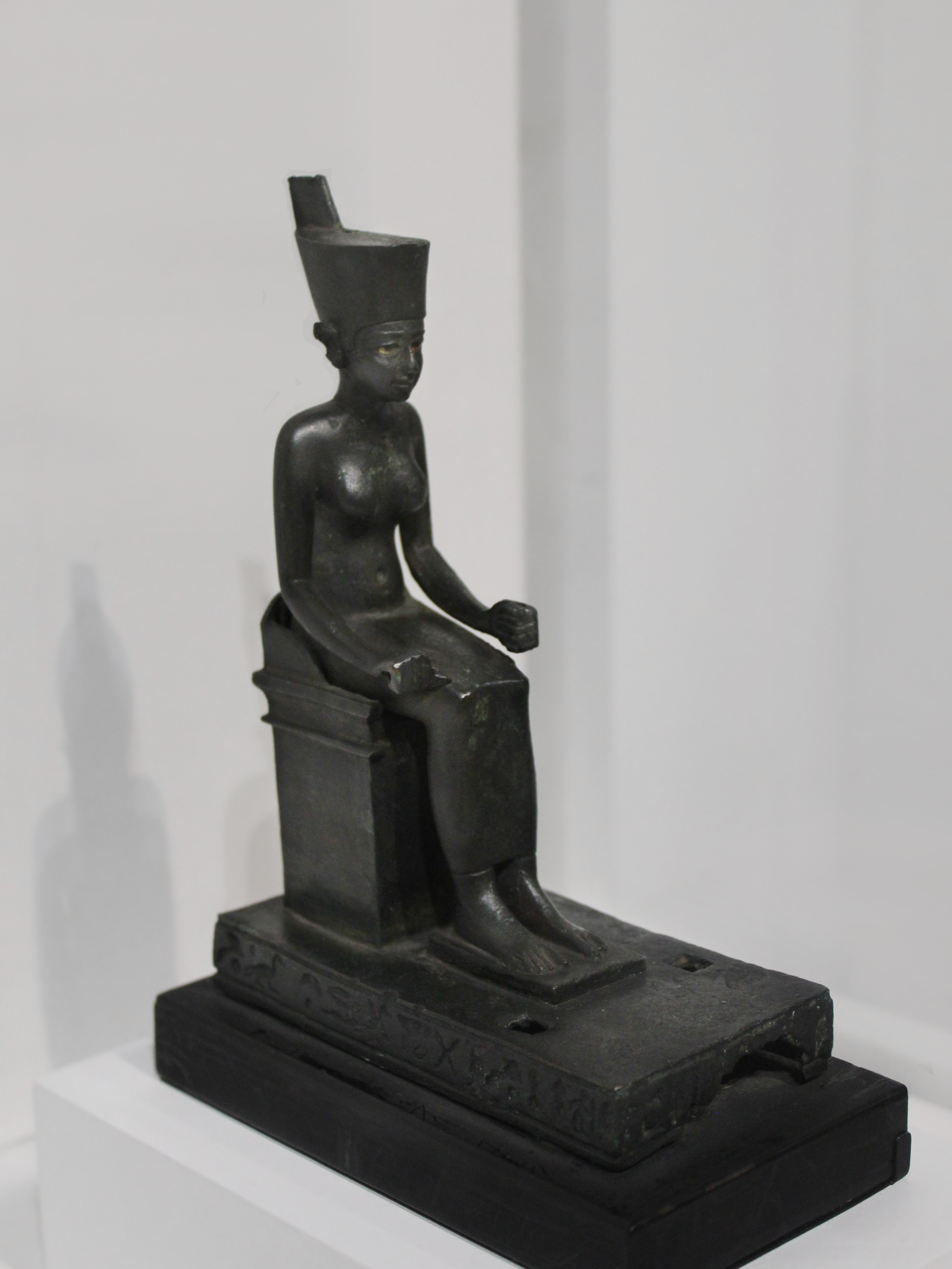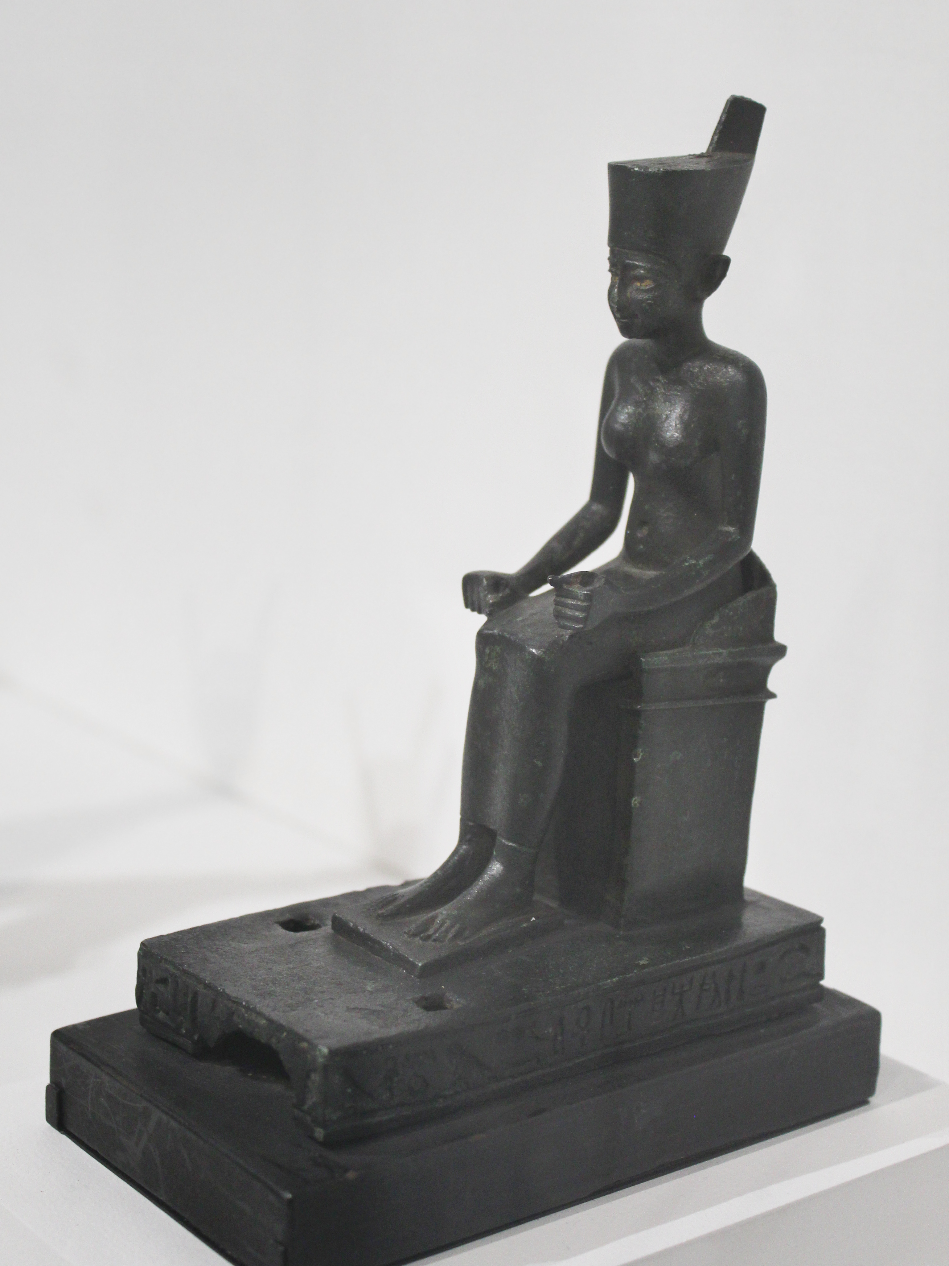 This seated bronze female figure represents the ancient Egyptian goddess Neith, patron of hunting and warfare. The goddess was known from predynastic times, and her early cult center was located at Sais, in the western Nile Delta. She wears the flat-topped headdress known as the red crown, which was emblematic of the northern portion of the country. Her close-fitting sheath is hardly visible, with the exception of the clearly indicated hemline at her ankles. The thin sheets of beaten gold covering the whites of her eyes provide the figure’s only ornamentation, strongly contrasting with the dark bronze surface. This figure from the Hearst collection is largely intact and well preserved, retaining its original and somewhat unusual pillar-shaped throne and a base inscribed for its first owner, Hor Khonsu." - (Nancy Thomas, (2008)