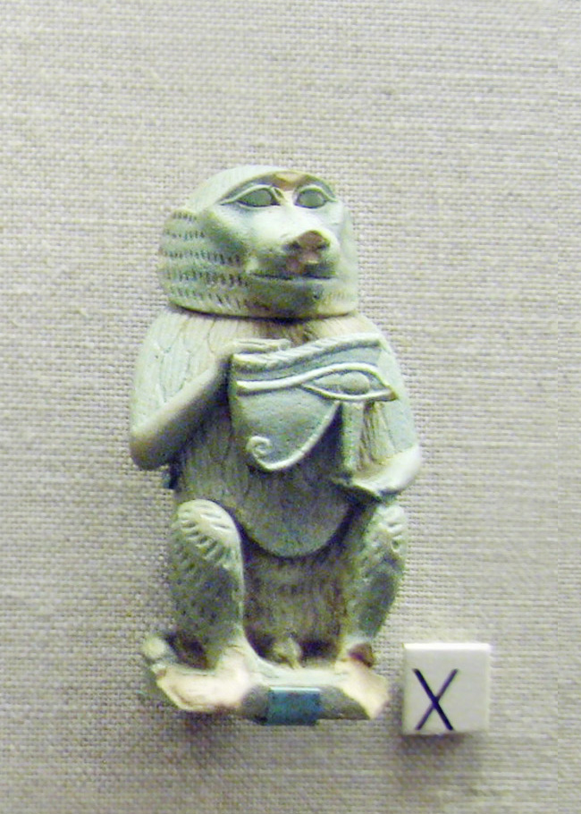 The placement of this piece by a museum window allowed a strong contrast of light and shadow which really brings out its form visually. It's an apt placement for the deity whose emblem is his vision. The falcon's vision became a symbol for the pharoah as he needed good long distance vision as he ruled his kingdom. Thoth, who healed the gods Set and Horus after their battle, presents Horus with his eye: ![]() Ape of Thoth, sitting holding sacred eye in front of chest Oriental Institute Museum 10658 "The ancient Egyptians believed their pharoah was the earthly incarnation of the great sky god Horus, who is depicted either as a falcon-headed man or the bird itself, a symbol of speed, power, and hunting prowess. Although the veneration of Horus as the symbol of the king is attested from the beginning of the Dynastic Period (c. 3100 BCE), the cult of the Horus-king gained unprecedented prominence during the Ptolemaic Period." To see examples of Horus connected with the king, please see this image in its gallery page. |
