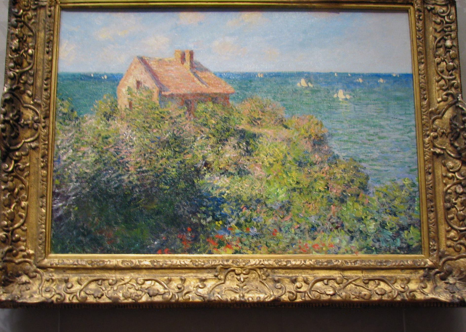 "A native of Normandy, Monet returned to paint the coastline throughout his career. In 1882 he spent six months there, along the English Channel, where this lonely house perched on a cliff caught his fancy. Built as lookout posts for customs agents during the Napoleonic wars, such structures were commonly used in the later 19th century as sheds for fishermen to store their nets. Monet turned out fourteen views of this particular shed during his stay." (From info card)