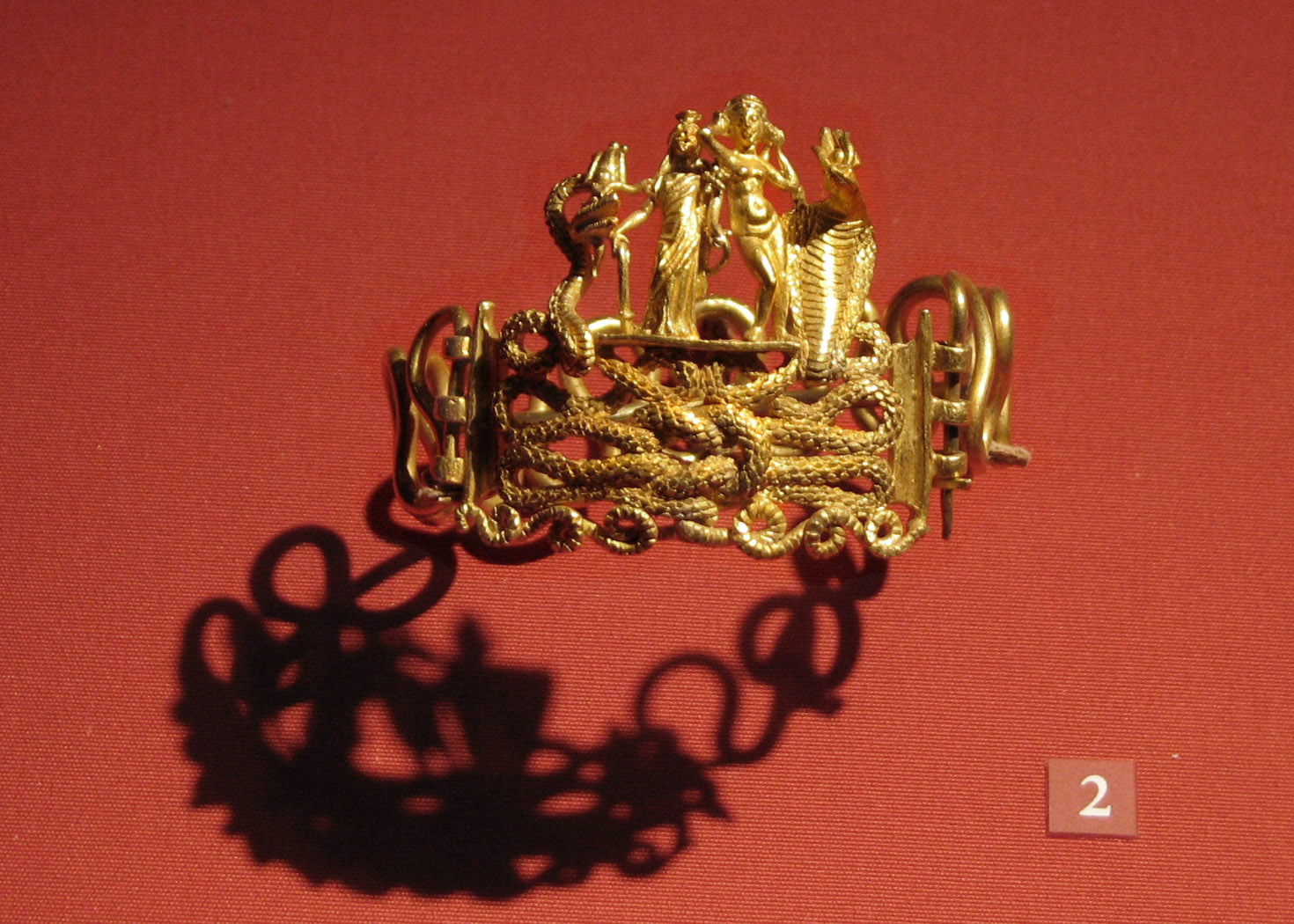 "Powerful talismans of fertility and good destiny are woven into this rich golden composition. The bodies of two snakes intertwine to form a Herakles knot, the centerpiece of this bracelet. The snake on the left represents Agathodaimon, and the cobra on the right Terenouthis, two agrarian/fertility deities associated with Serapis and Isis, respectively. On the platform between them stand two goddesses, Isis-Tyche (or Isis-Fortuna), a deity closely associated with Alexandria, and the nude Aphrodite."