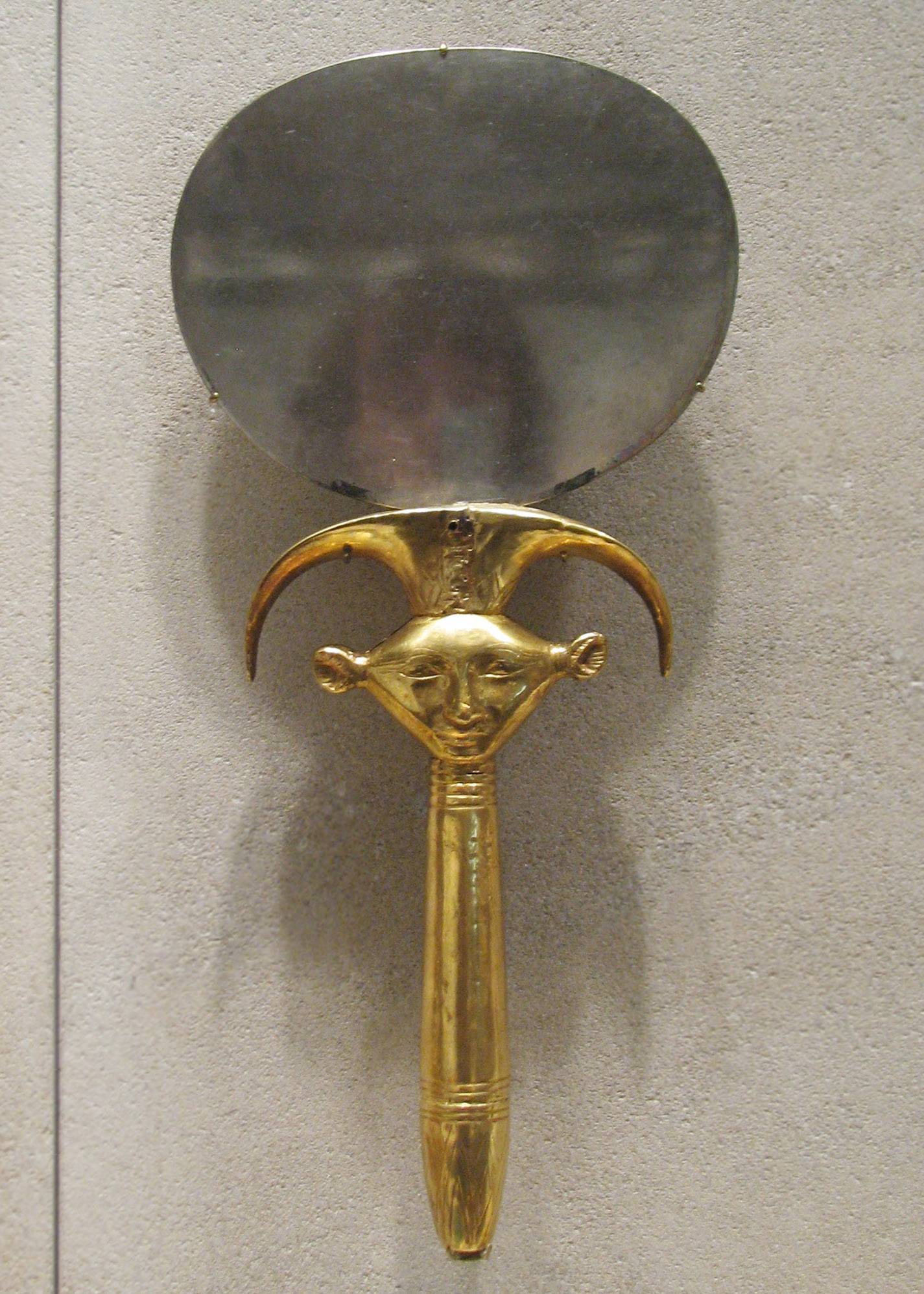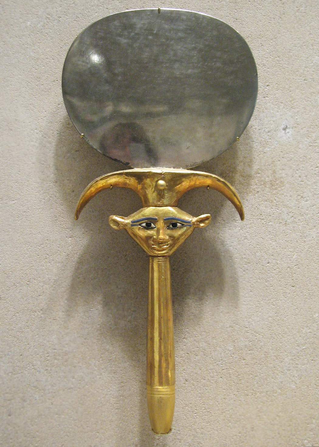 "The handles of these two mirrors were made of wood (restored) covered with gold foil. The faces with cow's ears are emblems of Hathor, the goddess of beauty. The blue and black inlays and the lower tip of the larger mirror are restored."