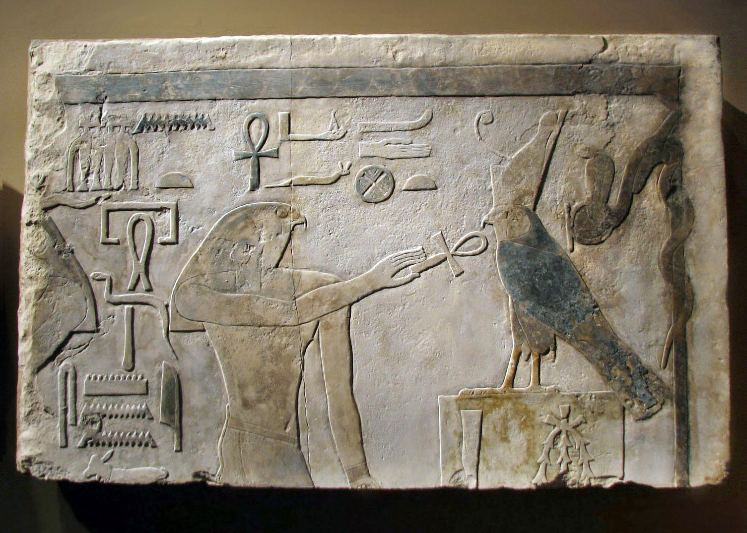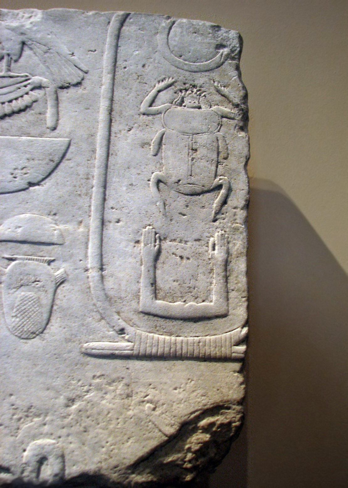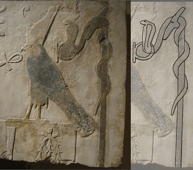 | (From info cards) "The reliefs in this gallery were discovered in the foundations of the funerary temple of Amenemhat I at Lisht. Most of them bear his name, sometimes with that of his son and co-regent, Senwosret I. Because of their protected location many of the blocks are complete, and the colors are still fresh; several sculptural styles are represented. The site and buildings from which the blocks were taken have not been identified, but possibly they all derive from an earlier funerary temple at Lisht." (The following info refers to one piece I didn't photograph) "In the scene [not photographed], Amenemhat I, identified by his cartouche, faced his son, Senwosret I. Amenemhat's crown with its two tall feathers is visible below the protective wing of a hawk or vulture, the presence of Senwosret I is indicated only by his cartouche and the expression 'the king himself.' In the scene at [page top], Amenemhat I, identified by his Horus name and the beginning of his cartouche, was on the right. Senwosret I, represented here by his Horus name and the term 'the king himself,' again faced his father. Nekhbet, the vulture goddess of Upper Egypt, and Wadjet,the uraeus serpent goddess of Lower Egypt, perched on their respective plants, extend shen signs, signifying universal domination, to hawks surmounting the kings' names." In the brick of the top of this page, Wadjet is there extending the 'shen' sign. However, not to argue with the Met's writer, but that's not a papyrus plant, that's a Was scepter around which the uraeus serpent is coiled: |