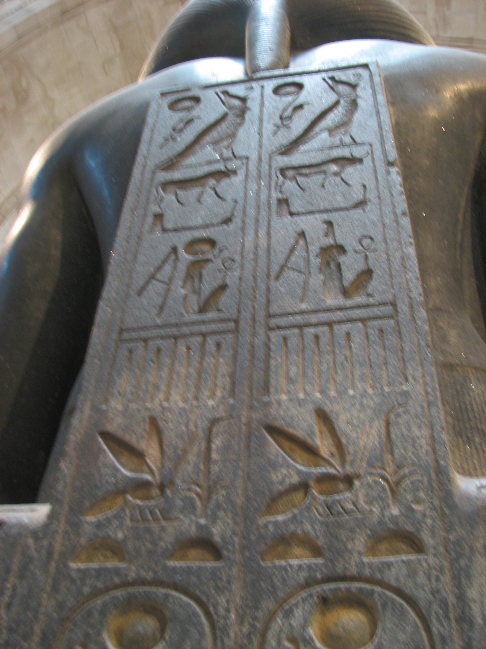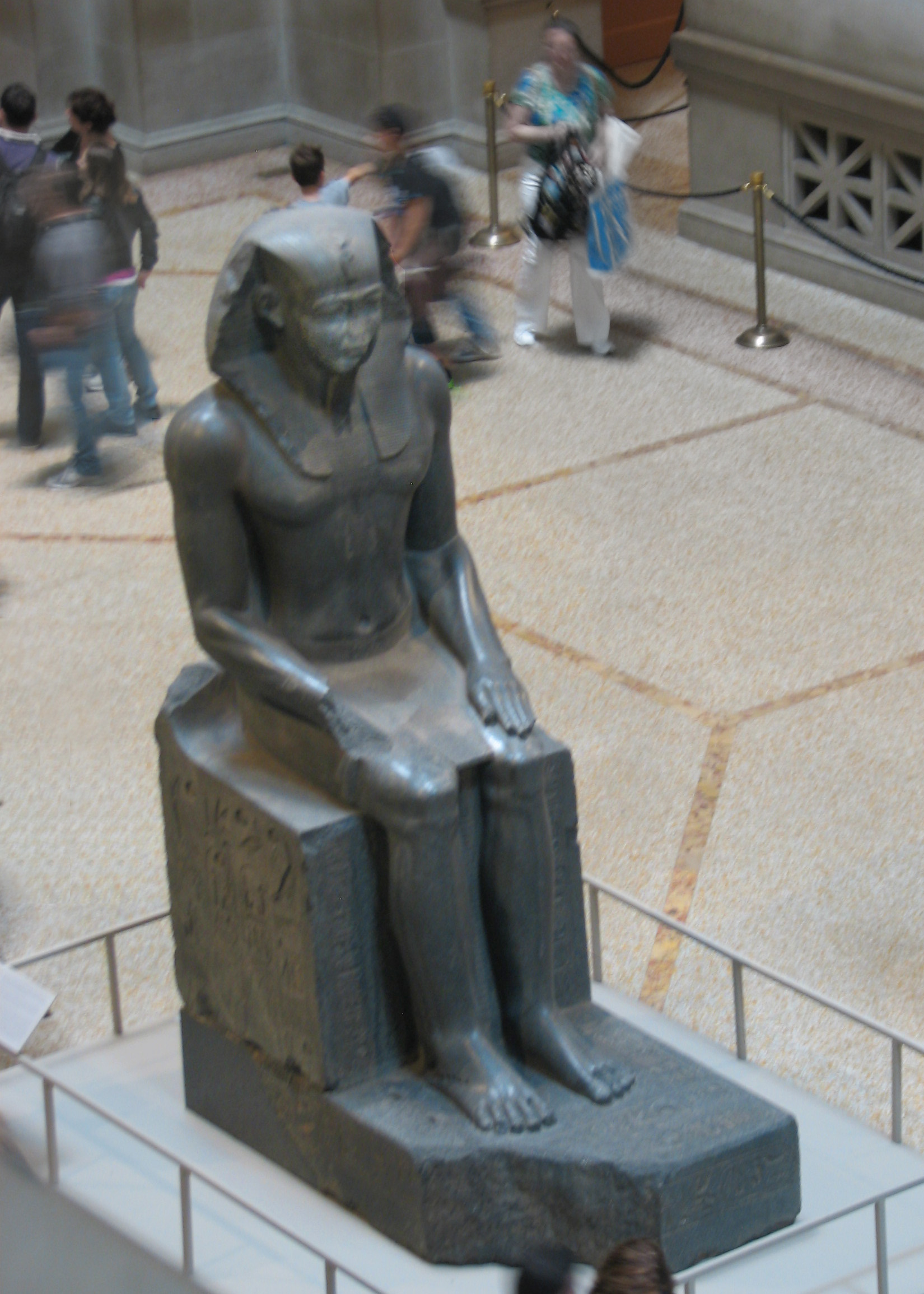 (From the info card) "Aquired in 1837 by the Berlin museum, this nearly nine-ton colossus has been assigned to Pharaoh Amenemhat II on the basis of style. It is a magnificent example of colossal ancient Egyptian statuary. "The single block of stone from which the statue was carved was quarried at Aswan and then shipped more than five hundred miles north to the area of Memphis (near present-day Cairo), where the sculpting was completed and the statue was erected within a temple complex. "Six hundred years later, during Dynasty 19, kings Ramesses II and Merneptah added their names to the statue, and some facial features were altered to resemble images of Ramesses II. At this time the statue presumably was transported to Piramesse (in the eastern Delta), the capital of the Ramesside kings, only to be moved again, two hundred years later, to Tanis, where the kings of Dynasties 21 and 22 resided. Traces of repair on the sides of the throne suggest that the lower part of the statue was broken during transport. The statue remained at Tanis until it was uncovered in the early nineteenth century." |