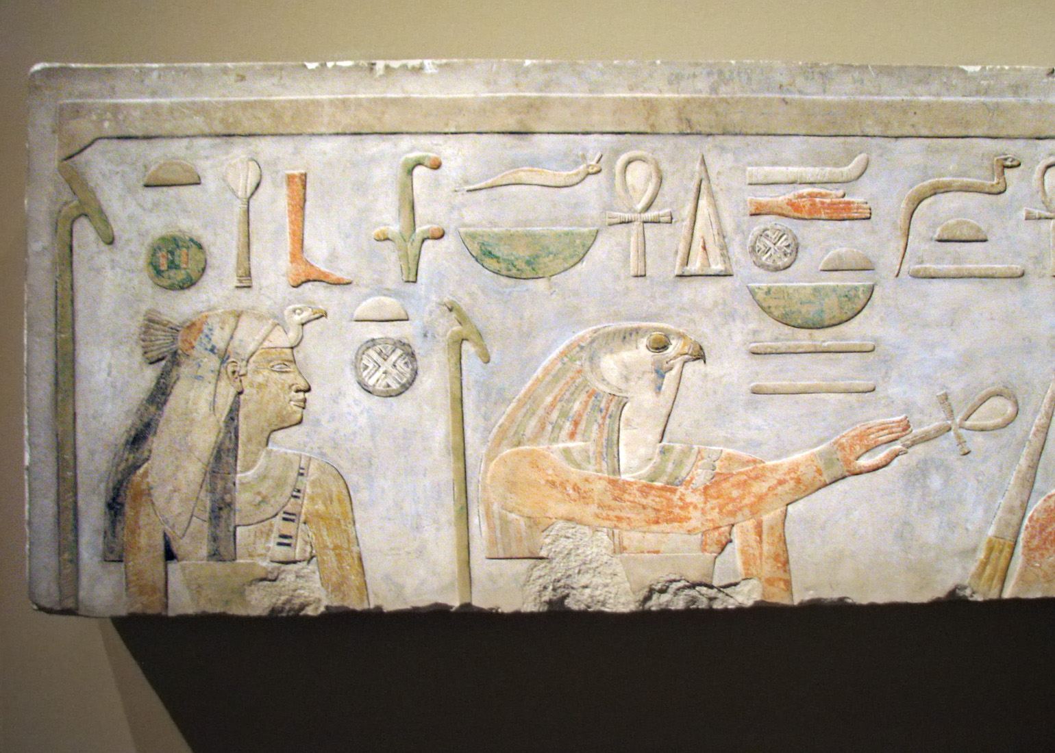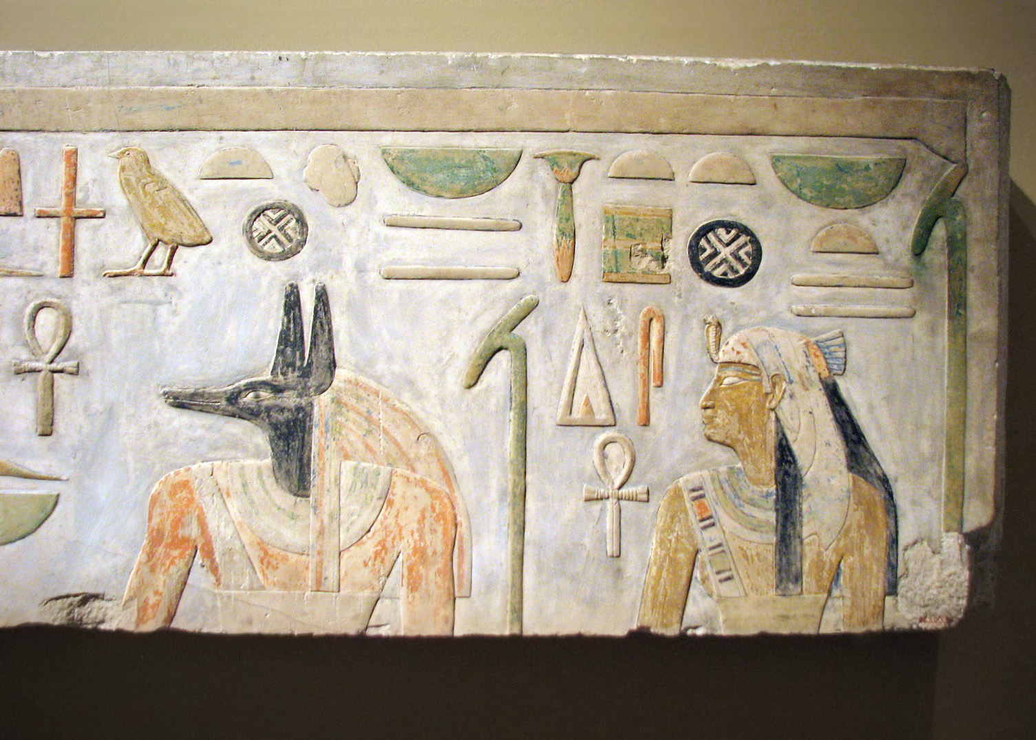 | (From info card) "The reliefs in this gallery were discovered in the foundations of the funerary temple of Amenemhat I at Lisht. Most of them bear his name, sometimes with that of his son and co-regent, Senwosret I. Because of their protected location many of the blocks are complete, and the colors are still fresh; several sculptural styles are represented. The site and buildings from which the blocks were taken have not been identified, but possibly they all derive from an earlier funerary temple at Lisht." (From museum website Above them all is the pet hieroglyph for 'sky'. Two Was-scepters hold up the sky. Amenemhat is receiving the blessings of the deities of Upper Egypt (Nekhbet, Anubis) and Lower Egypt (Wadjet, Horus). Usually, it is Set giving the Upper Egypt blessing, but here it is Anubis: "Seth and Anubis have complex and interrelated functions. Both deities have, from very early times, close associations with kingship. Apart from frequent statements in the Pyramid Texts that the king takes on the form of Anubis or Upwawet or more generally assumes the shape of a jackel, there the pharoah is clearly identified both with Horus and with Seth." (From "Seth and the Jackals", by Terence DuQuesne, in _Egyptian Religion_) |
