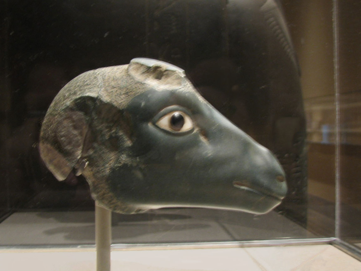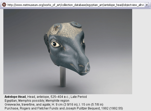 Description: "This head of an antelope is a masterpiece of Late period animal sculpture. The sculptor carved the hard, fine-grained stone so skillfully that the animal's delicate bone structure is distinctly conveyed. The almond-shaped eyes have been inlaid with alabaster and banded agate, creating an especially alert and lifelike gaze. The horns, probably made of ivory or gilded wood, were once attached to the head with tenons."