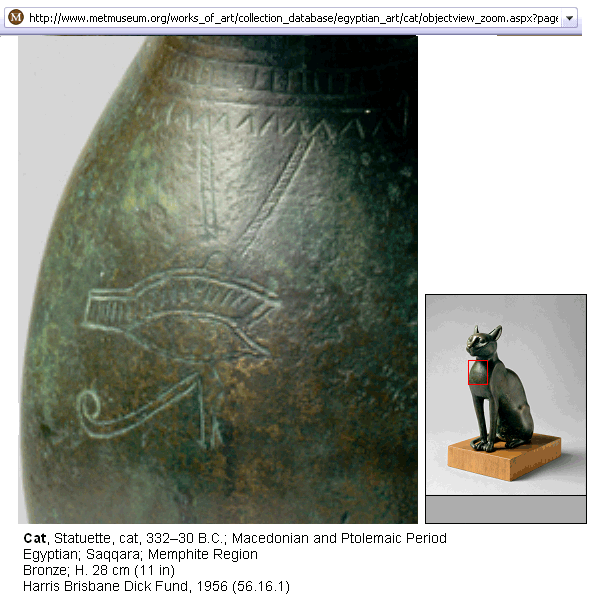 Museum website description "When fastened together along an almost invisible seam, the two cast halves of this figure became the container for a mummified cat. The cat was the sacred animal of the goddess Bastet. In rituals performed in her honor, mummified cats were buried within her temple precincts. Clearly this is not an ordinary cat. Its pierced right ear once held a gold ring (now lost), and suspended from its incised necklace is a wedjat-eye pendant. An impression of majesty is created by the cat's erect and dignified pose and the alert expression of the eyes. The sleek muscles and long graceful legs convey a sense of controlled power. "For the Egyptians, the goddesses Bastet and Sakhmet were two aspects of divine power. Sakhmet, the lioness, represented dangerous, potentially destructive forces."