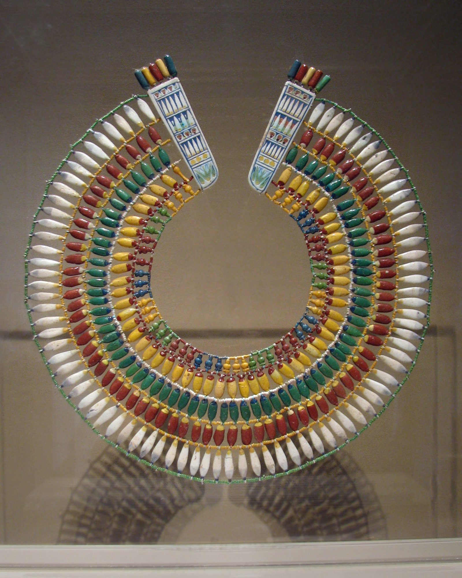 "This necklace of faience beads, called a broad collar, is a durable version of the elaborate perishable floral collars worn by banquet guests. Such necklaces are seen in banquet scenes and are painted on statues from the Old Kingdom onward. The beads in this example imitate a row of cornflowers (center), three rows of dates (middle), and a row of lotus petals (outside). These rows are joined by strands of small ring beads. The rows end in rectangular terminals adorned with blue lotus blossoms, buds, and petals interspersed with poppy petals and persea fruit. The stringing is modern. Three ancient collars of real flowers may be seen in the adjacent gallery 17a."