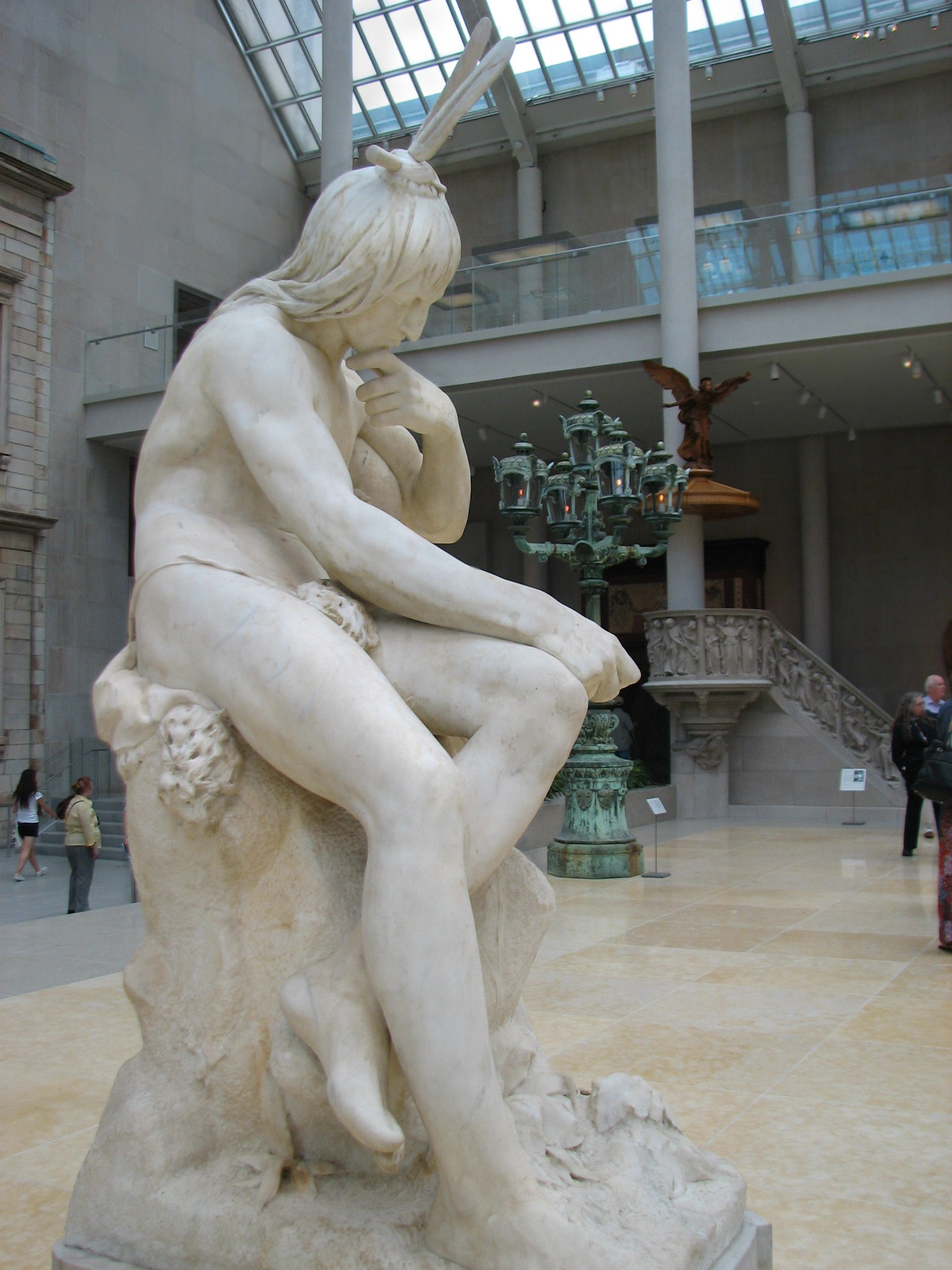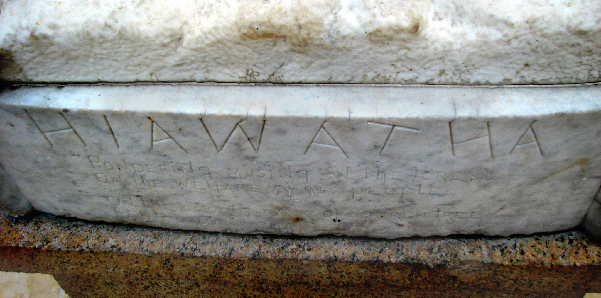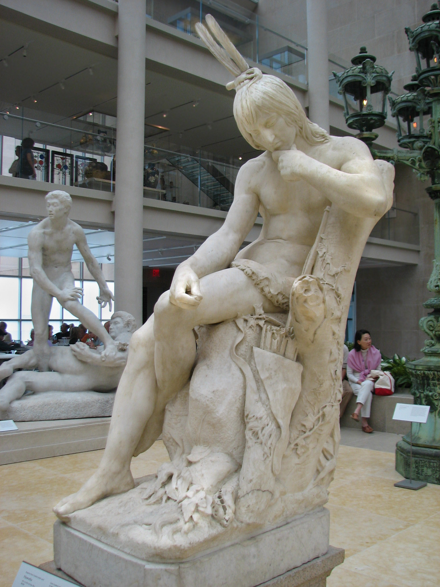 Museum website description "After three years of academic training in Paris, Saint-Gaudens relocated to Rome in 1870 and soon began modeling Hiawatha in his studio at the Palazzo Barberini. The inspiration for his full-size seated nude was drawn from Henry Wadsworth Longfellow's epic poem "The Song of Hiawatha" (1855), a popular wellspring of themes for American artists during the late nineteenth century. Saint-Gaudens represented the central protagonist, a Chippewa chief, as a contemplative figure seated on a rock, leaning against a tree trunk with his quiver of arrows and bow nearby, and "Pondering, musing in the forest / On the welfare of his people," as the excerpt from Longfellow's poem inscribed on the marble base declares. Saint-Gaudens vowed he would "astonish the world" with his ambitious early piece, and, indeed, he sold the unique marble to Edwin D. Morgan, a former governor of New York." |