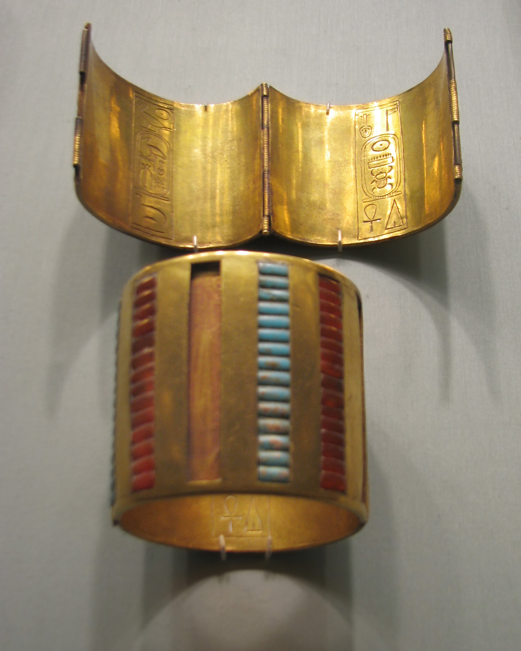 ![]() Hinged bracelets New Kingdom, Dynasty 18, reign of Thutmose III, ca. 1479–1425 B.C.E. Egypt, Upper Egypt; Thebes, Wadi Gabbanat el-Qurud, Tomb of the 3 Foreign Wives of Thutmose III, Wadi D, Tomb 1 Gold, carnelian, turquoise, glass, W. 5.9 cm (2 5/16 in) Fletcher Fund, 1926 "Three pairs of hinged bracelets (26.8.125–.130) are associated with the tomb of three foreign wives of Thutmose III. They are all made of burnished gold inlaid with carnelian and glass that was originally turquoise and dark blue, but has faded. Each is inscribed on the inner surface with the cartouches and epithets of Thutmose III suggesting that they were a gift of the king." (From Museum website) |