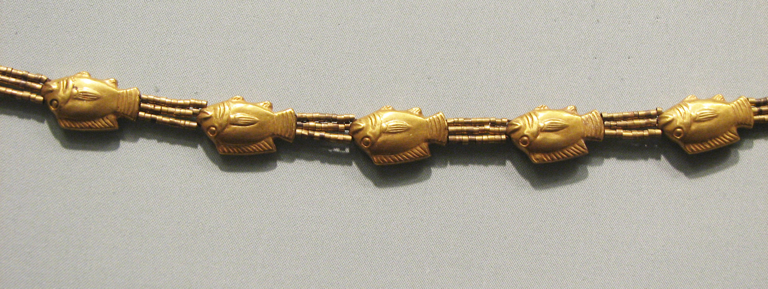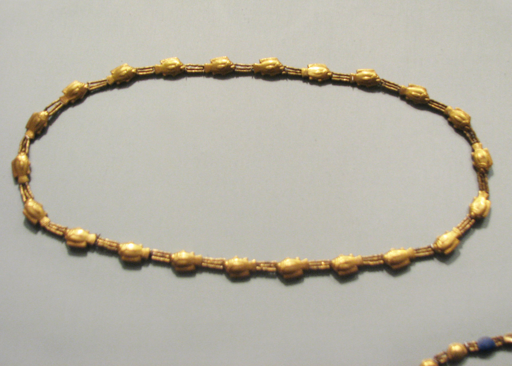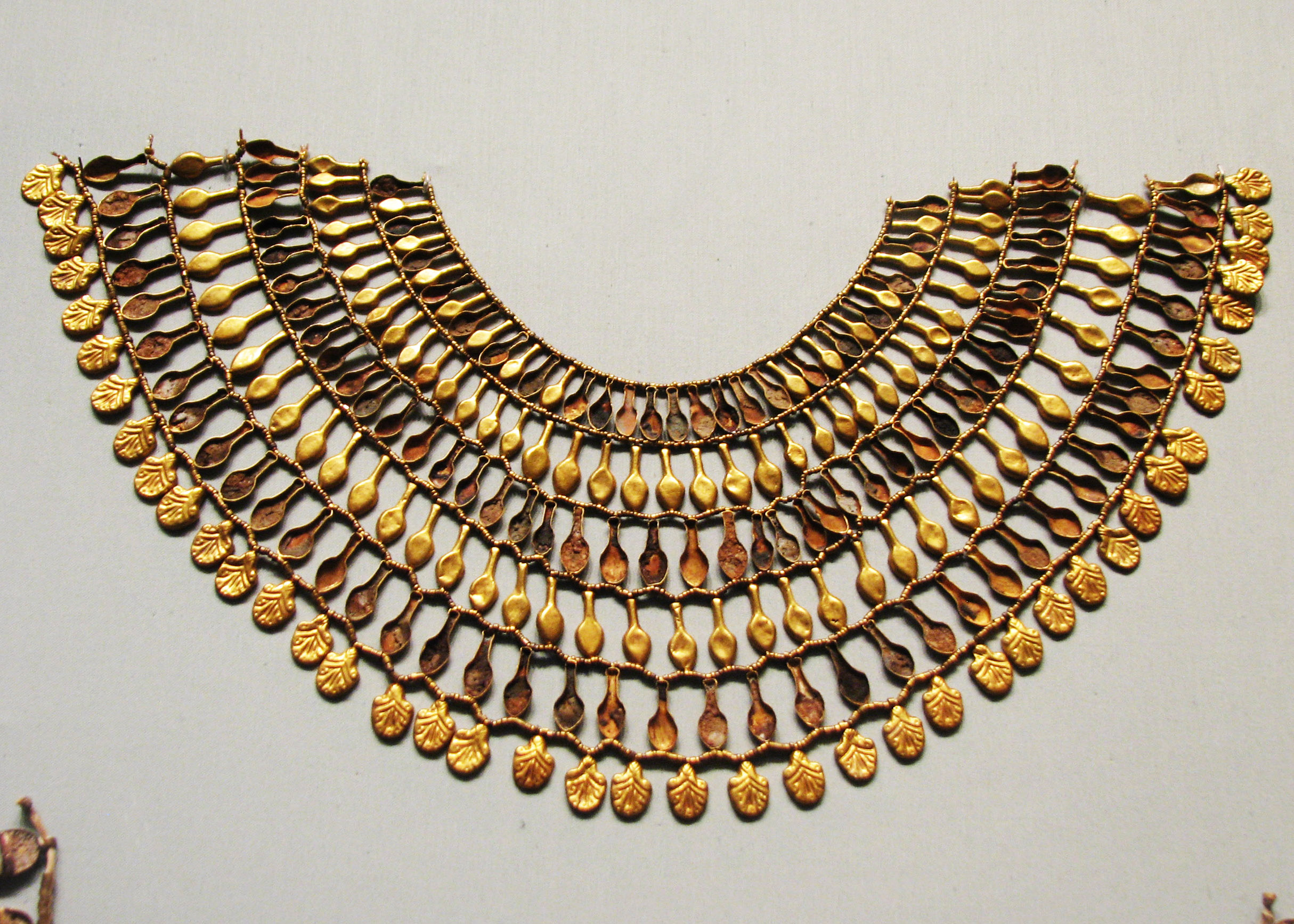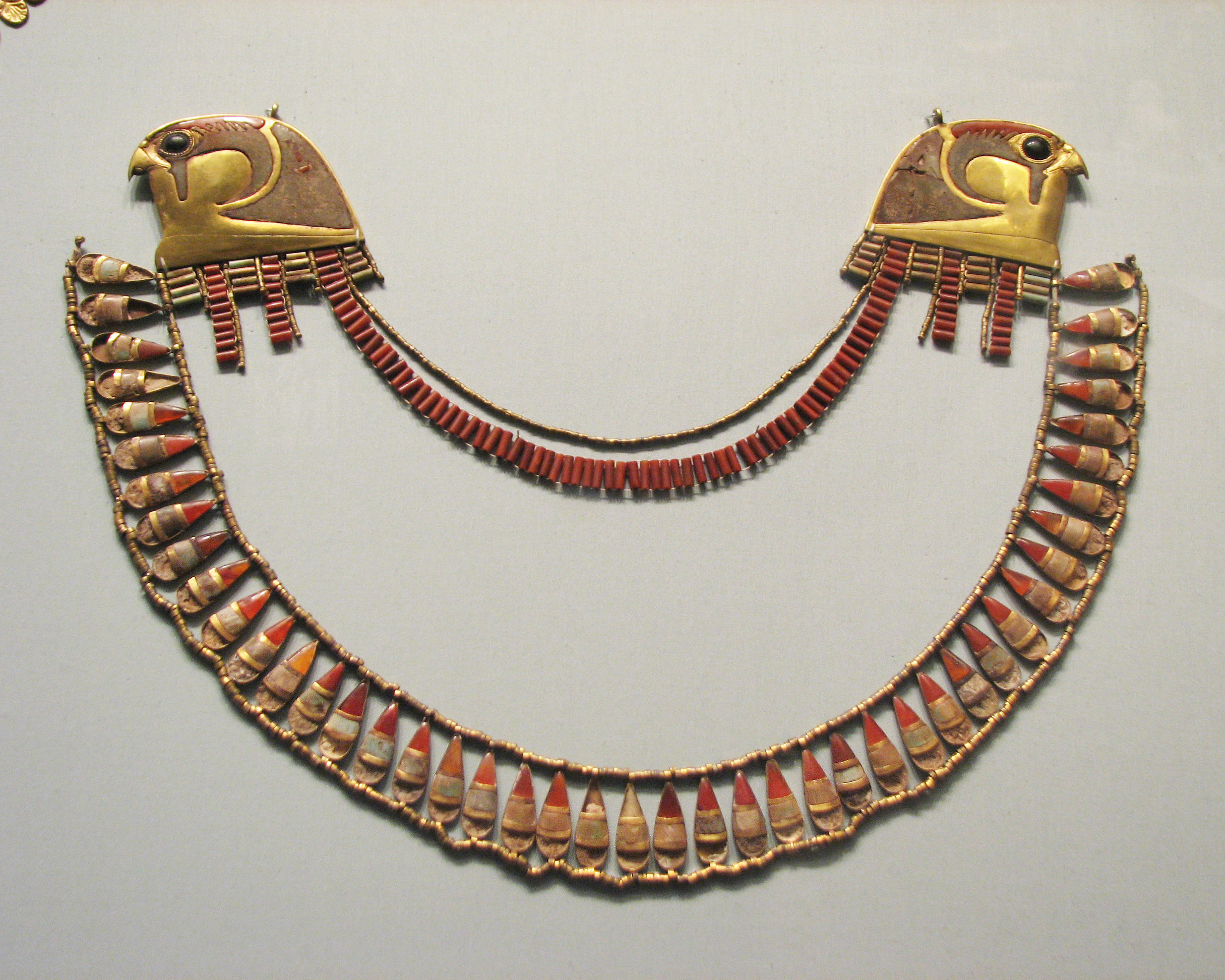 (From info card): "Broad collars were the most frequently worn pieces of jewelry among the royalty and elite in ancient Egypt. These were certainly gifts from Thutmose III whose names is inscribed on the backs of the falcon-headed terminals and is inlaid on the front of the lotus terminals. The collar at the [bottom] is made of palmettes and nefer heiroglyphs, which mean 'beautiful'".