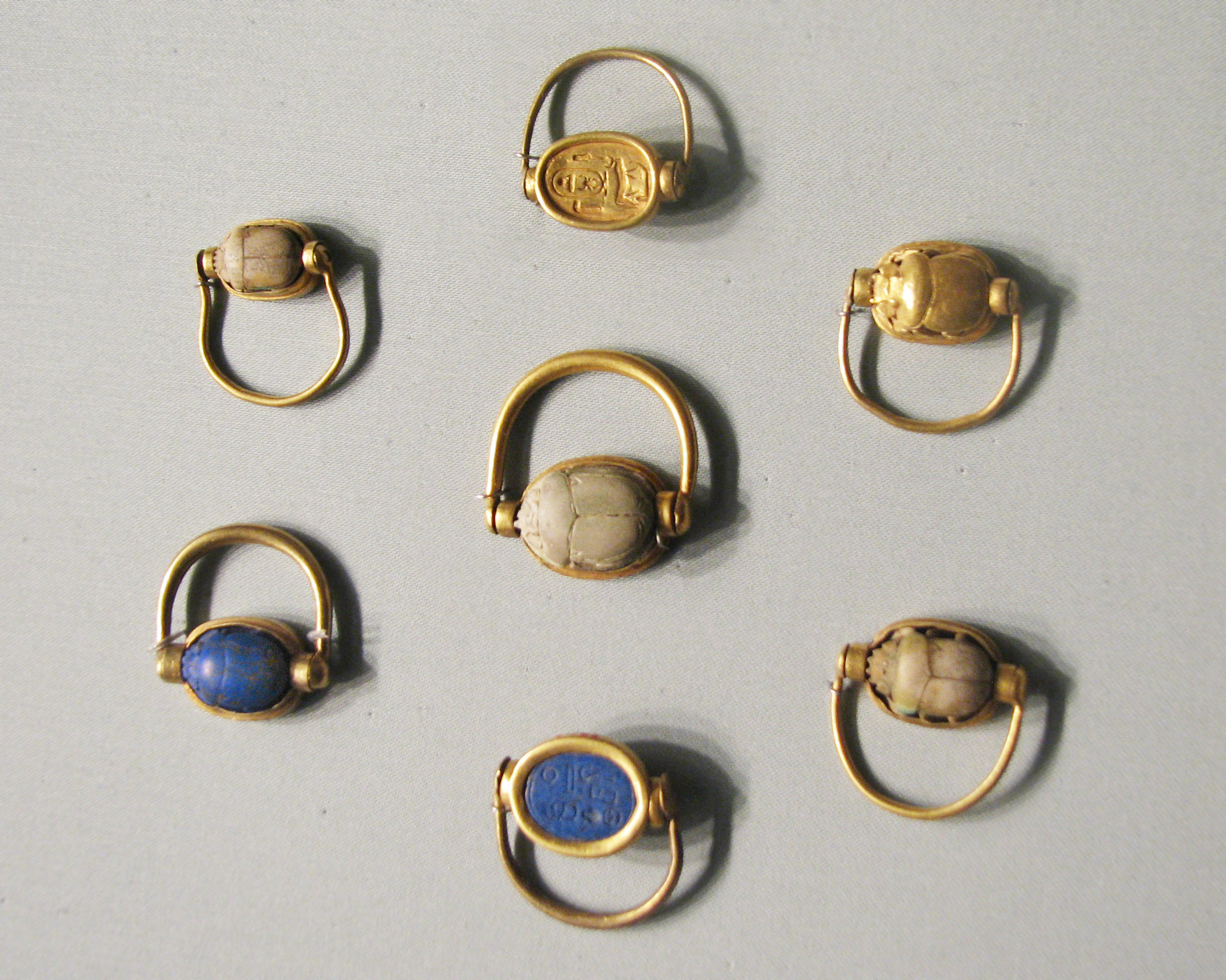 (From info card): "The scarabs in these rings are all inscribed with the name of Thutmose III.