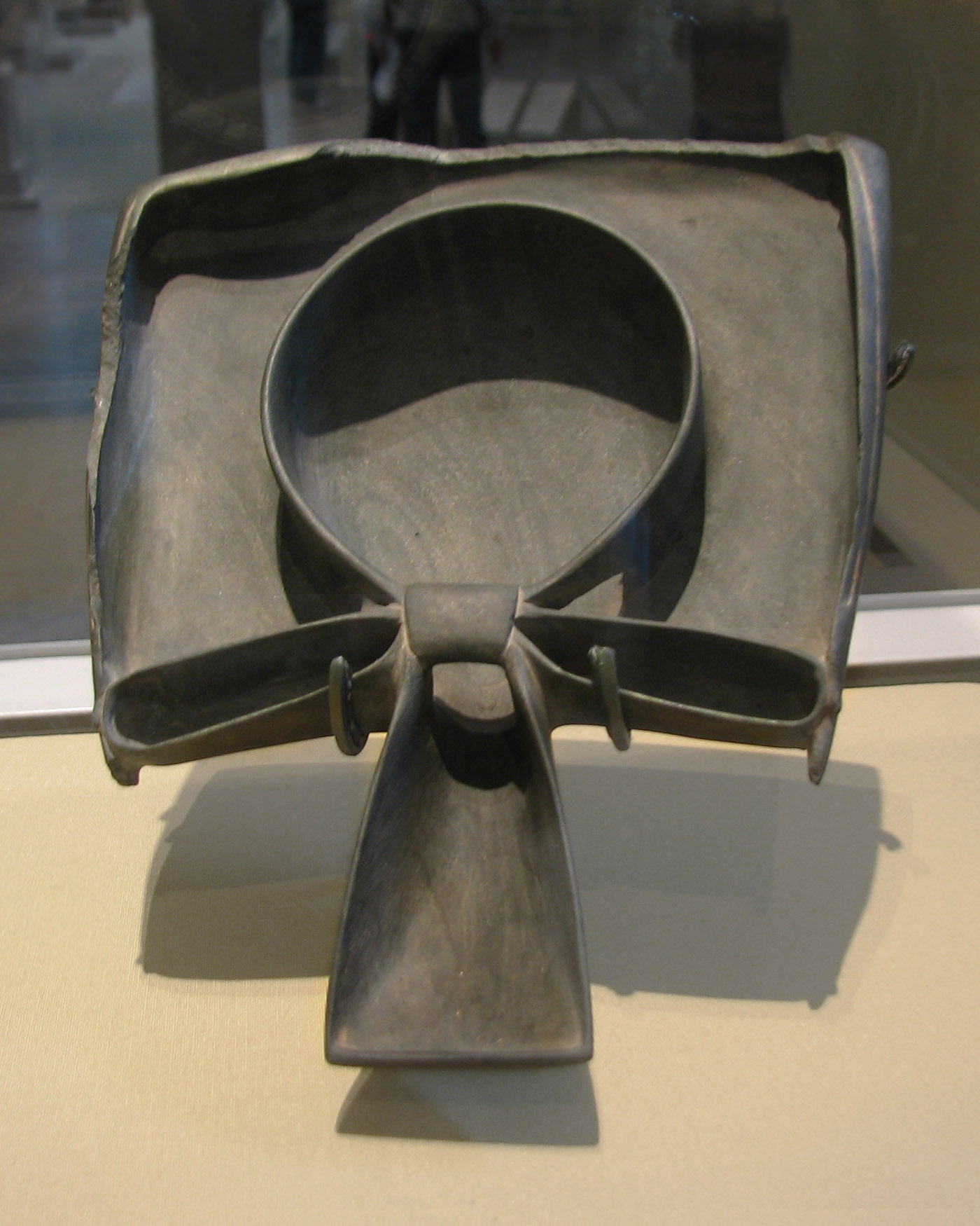 (From info card) "Experimention in carving stone vessels reached its zenith in the Early Dynastic Period. Craftsmen were highly successful at translating the plasticity associated with clay into stone, and this spouted dish is a fine example. The votive dish has two hieroglyphs; the pair of arms reads ka (spirit), and the cross-like symbol offered by the arms translates as ankh (life). The ankh's base serves as the spout, and several interior walls are pierced to allow liquid to flow through the emblem." It's a marvelous evocation of 'feeding the ka', (aka 'life to thy spirit' as the museum website has it). And the excellent workmanship so early in Egyptian history is amazing. I found a seal of the First Dynasty king Den illustrated in Petrie's _Royal Tombs II_: |