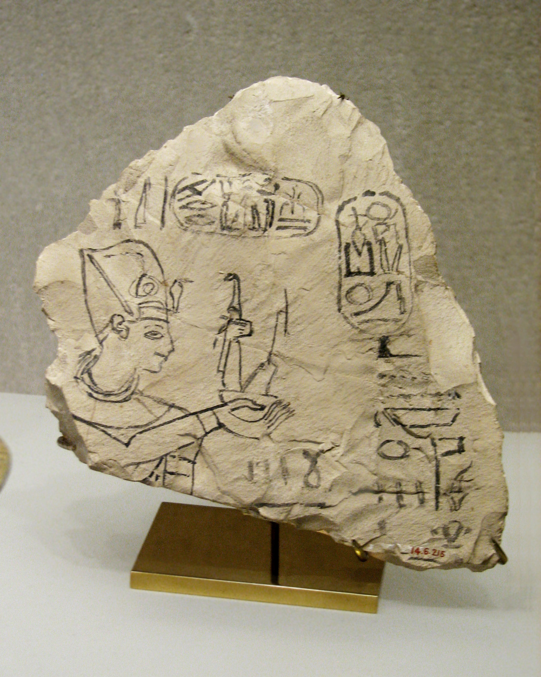 "Potsherds and stone flakes bearing writing and/or depictions. They are very common in New Kingdom Thebes and then again in the Ptolemaic, Roman and Coptic Period. The sherds and stone flakes were used as cheaper substitute for the expensive papyrus. Writings on ostraca are often short notes, accounts or literary excerpts in some cases possibly written by pupils."