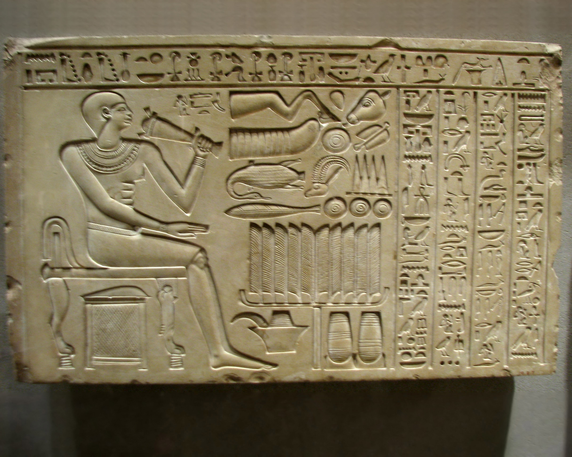 (From info card) "The text on this masterpiece of early Middle Kingsom relief art contains references to other figures of the time --such as Maaty's oversee, the treasurer Bebi, who later became a vizier, and an ancestor of the ruling family called Intef 'the Great' -- demonstrating the close ties that bound rulers and followers together in the Theban society of the time" Note the jewelry chest under Maaty's chair. The Met has one shaped like this: