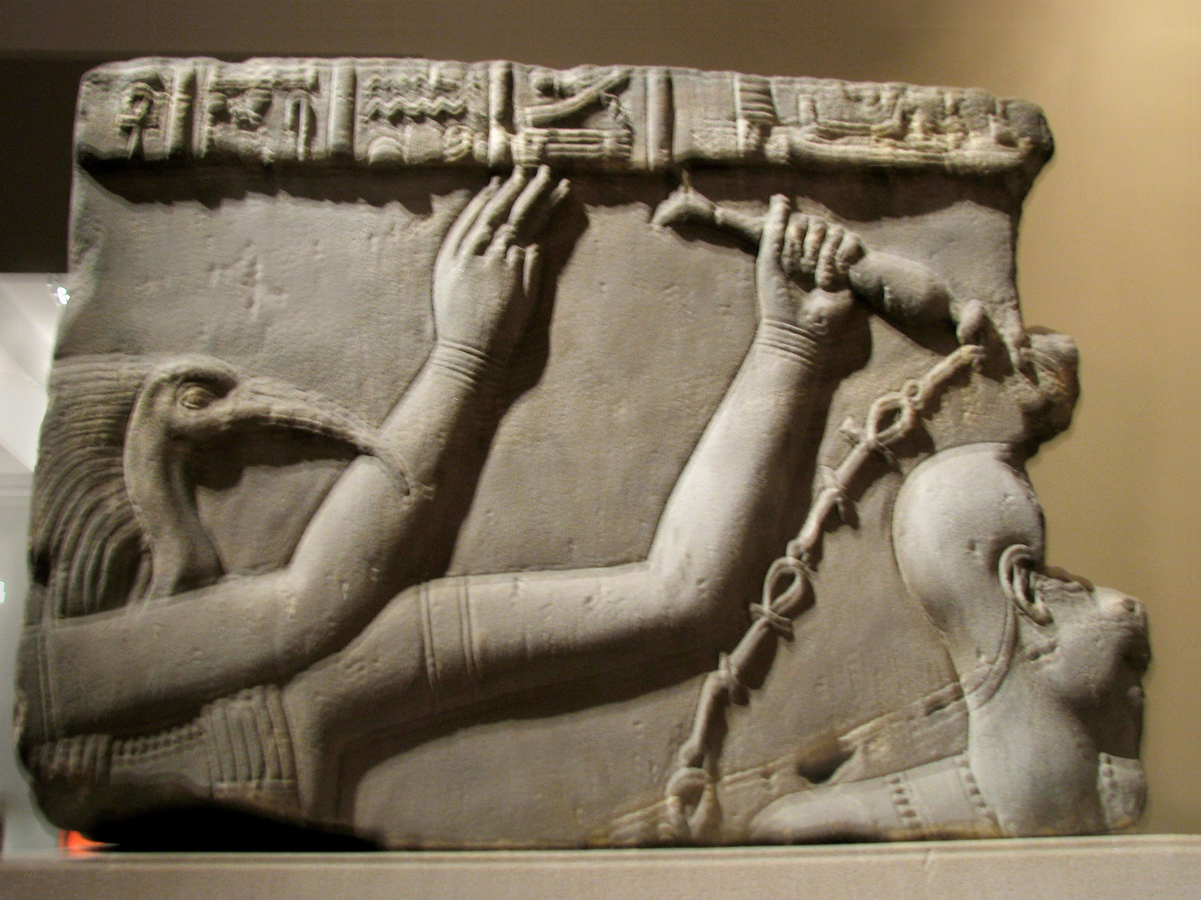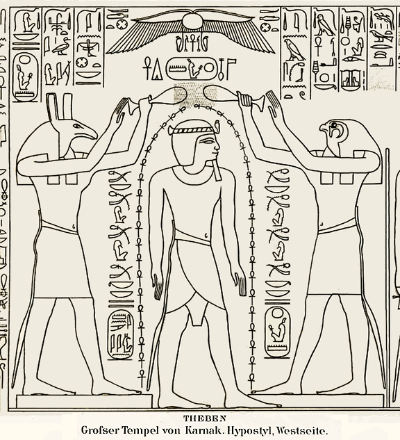 From info card: "This block originally formed part of a screen wall that connected the four front columns and the sidewalls of the temple of Harendotes ('Horus the Avenger') on the island of Philae. The relief represents the 'Baptism of Pharoah,' a purification ritual that was part of Egyptian coronation ceremonies. The gods Horus (not preserved) and the ibis-headed Thoth poured water - here represnted by streams of ankh (life) and was (dominion) hieroglyphs - over the head of the king. The pharaoh whose head is partially preserved is a Claudian emperor most probably either Claudius or Nero." The baptism of the pharoah is a consistent theme throughout Egyptian history. In earlier dynasties the gods Set and Horus were the baptisers, and there are many examples of it. In addition to the one shown below from Karnak, there is one at Medinet Habu. |