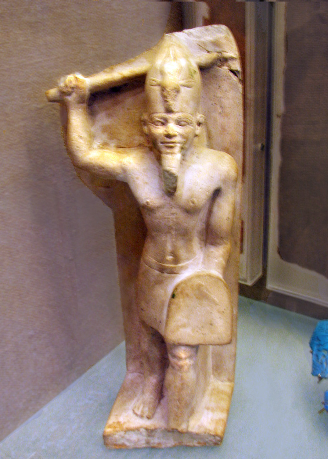 Reshef, (also Resheph meaning 'lightning') is a Near Eastern deity that was absorbed into the Egyptian pantheon. This is a God of war, storms and thunder. He's also called Baal-Hadad, or Baal-Sapon (Baal Zephon), "Lord of Thunder". Sharing many of Set's characteristics, he became more associated with Set after the New Kingdom. He's depicted as a warrior who holds a shield in his left hand, a club in his right, and upon his head is the White Crown with a horned gazelle. The gazelle is a very ancient symbol of the god which indicates his sovereignty over the desert.