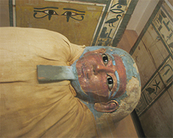 ![]() Mummy of Ukhhotep, son of Hedjpu Egypt, Middle Egypt, Meir (Mir), Khashaba Middle Kingdom, Dynasty 12, ca. 1981–1802 B.C.E. Cartonnage, wood (ficus sycomorus), paint, linen, human remains, obsidian, gold, Egyptian alabaster Dimensions: l. 196.2 x w. 50.8 x d. 33 cm (77 1/4 x 20 x 13 in.) (depth measured at nose of mask) Rogers Fund, 1912, Accession Number: 12.182.132c I didn't photograph Ukhhotep's coffin, except what shows in the photo above. Fortunately the museum website has many photos. One of their captures of the coffin's hieroglyph's amuses me, because the face of the owl looks rather like that of a cat: