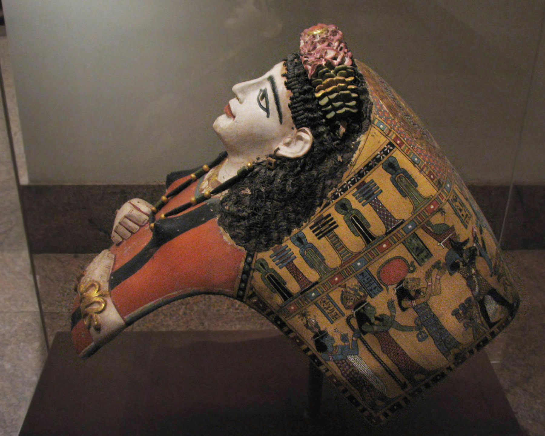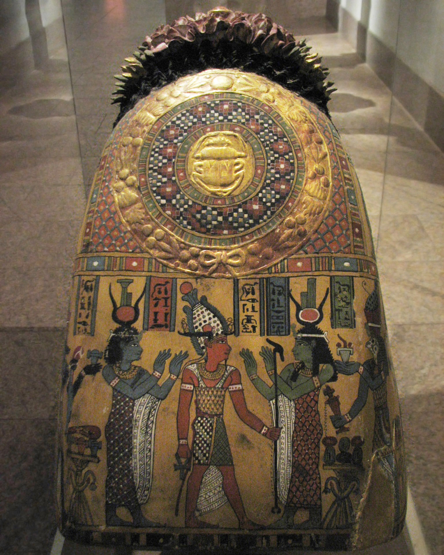 Adapted from the gallery label and museum website info: "At the lower edge of the tunic, two holes were used for attaching the mask to the mummy. "The back of the woman's head is represented as resting on a decorated support. Directly beneath the top of her head is a gilded wreath encircling a scarab beetle that represents the transformation of rebirth. Below this, the god Osirus [who dies and is reborn] is at the center. Several deities serve as witnesses to the deceased's resurrection. On the right are Isis, Horus, Amun, Thoth and Re. On the the left are Nephthys, Anubis, Tefnut, Hathor and Seshat. |