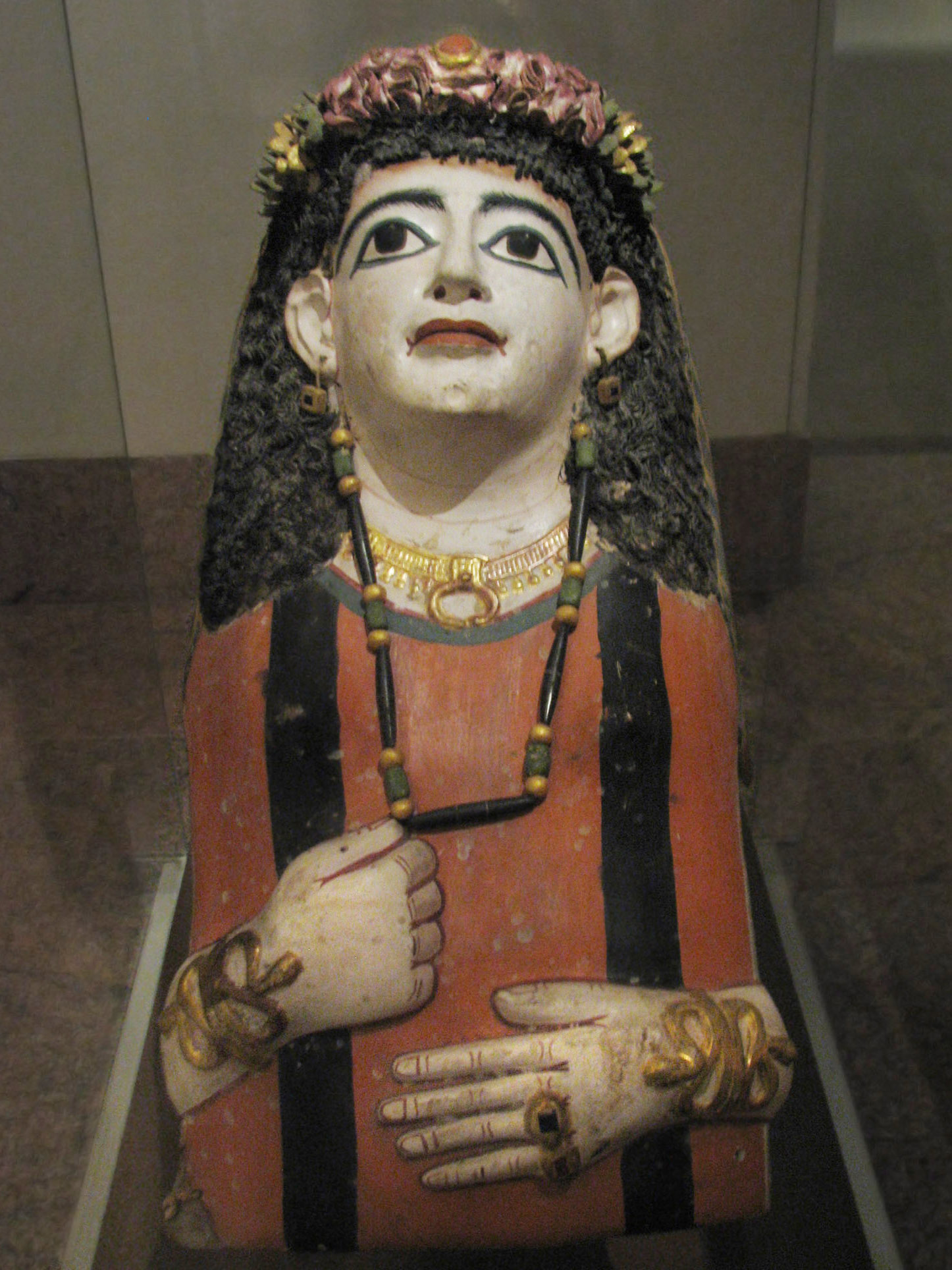 Adapted from the gallery label and museum website info: This woman is represented as if lying flat upon a bier. She wears a long Egyptian-style wig made of plant fibers. Fine plaster has been molded above the wig to imitate a thick garland of white rose petals tipped in pink, into which is set a red stone. On her ivory-colored skin the features are drawn in deep saturated colors. She wears a deep-red tunic with black clavi (vertical bands) and jewelry, including a crescent pendant and snake bracelets." |