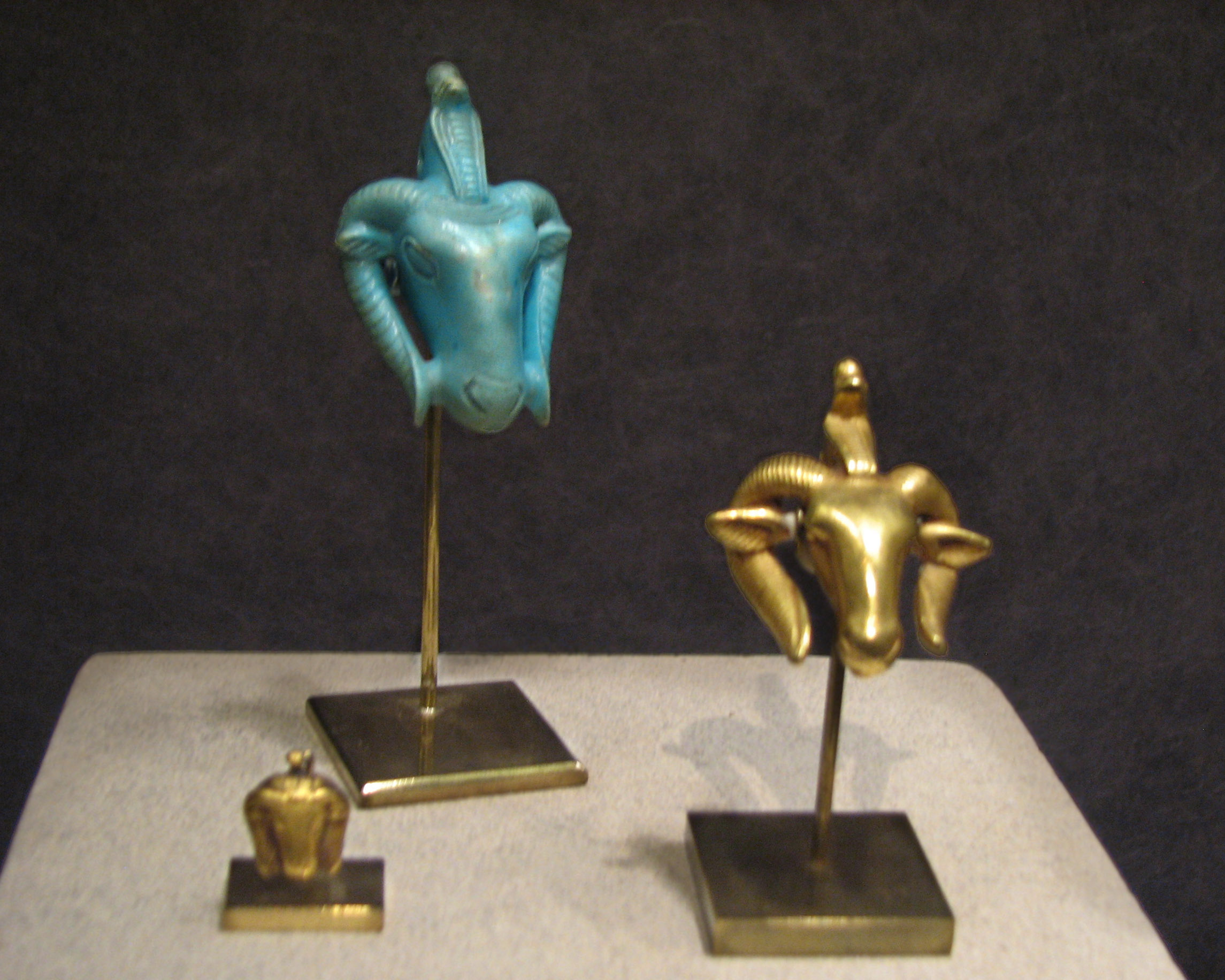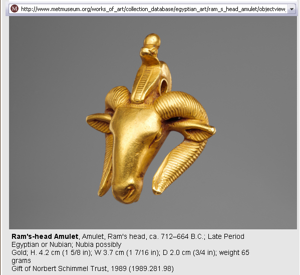 ![]() Faience ram's head pendant Late Period, Kushite, Dynasty 25, ca. 712–664 B.C.E. Gift of Edward S. Harkness, 1935, 35.9.8 Gold ram's head right: ca. 712–664 B.C.; Late Period Egyptian or Nubian; Nubia possibly Gold; H. 4.2 cm (1 5/8 in); W 3.7 cm (1 7/16 in); D 2.0 cm (3/4 in); weight 65 grams Gift of Norbert Schimmel Trust, 1989 (1989.281.98) Smaller gold ram's head pendant Gift of Edward S. Harkness, 1914 (14.7.2o) (Better view at Museum website)(Or here!) |