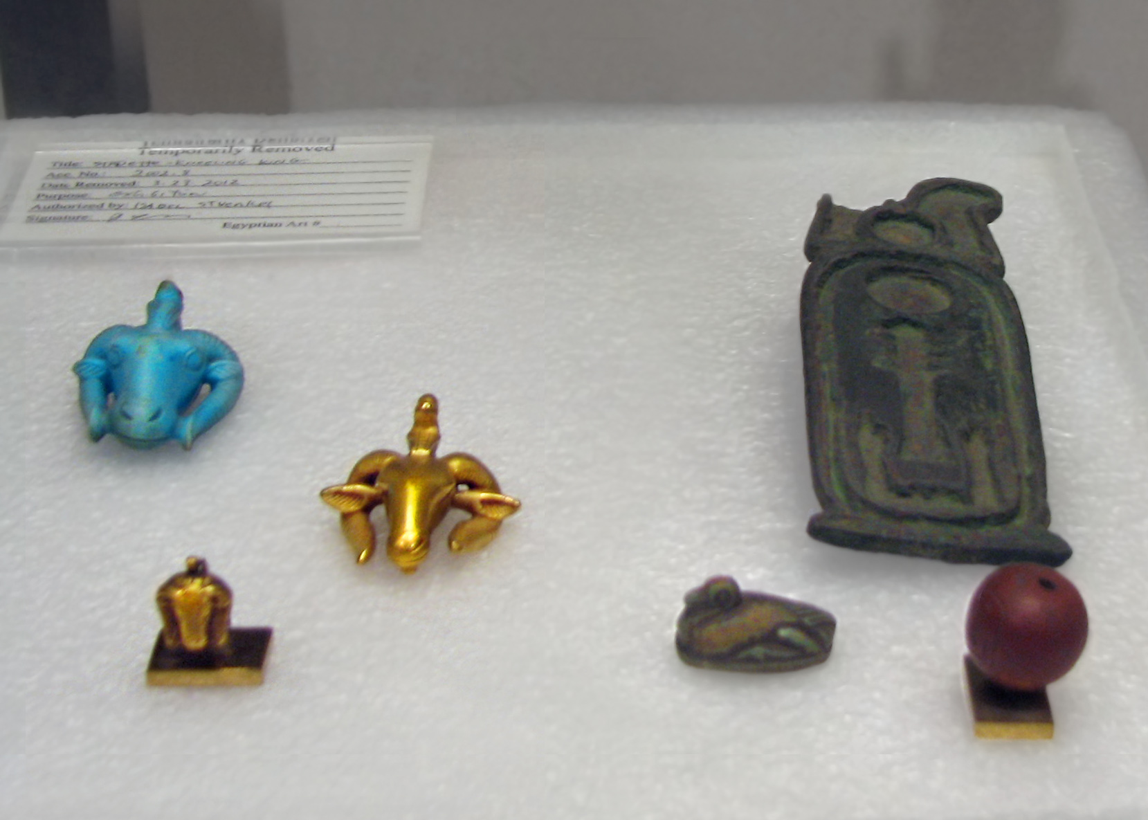 The museum website has a much better photo of the larger gold ram's head and the following info is from their site: "This amulet was probably made for a necklace worn by one of the Kushite kings. Representations show these pharaohs wearing a ram's-head amulet tied around the neck on a thick cord, the ends of which fall forward over the shoulders. Sometimes a smaller ram's head is attached to each end. Rams were associated with the god Amun, particularly in Nubia, where he was especially revered. The Nubians were superb goldsmiths, as demonstrated by the workmanship of this amulet." |