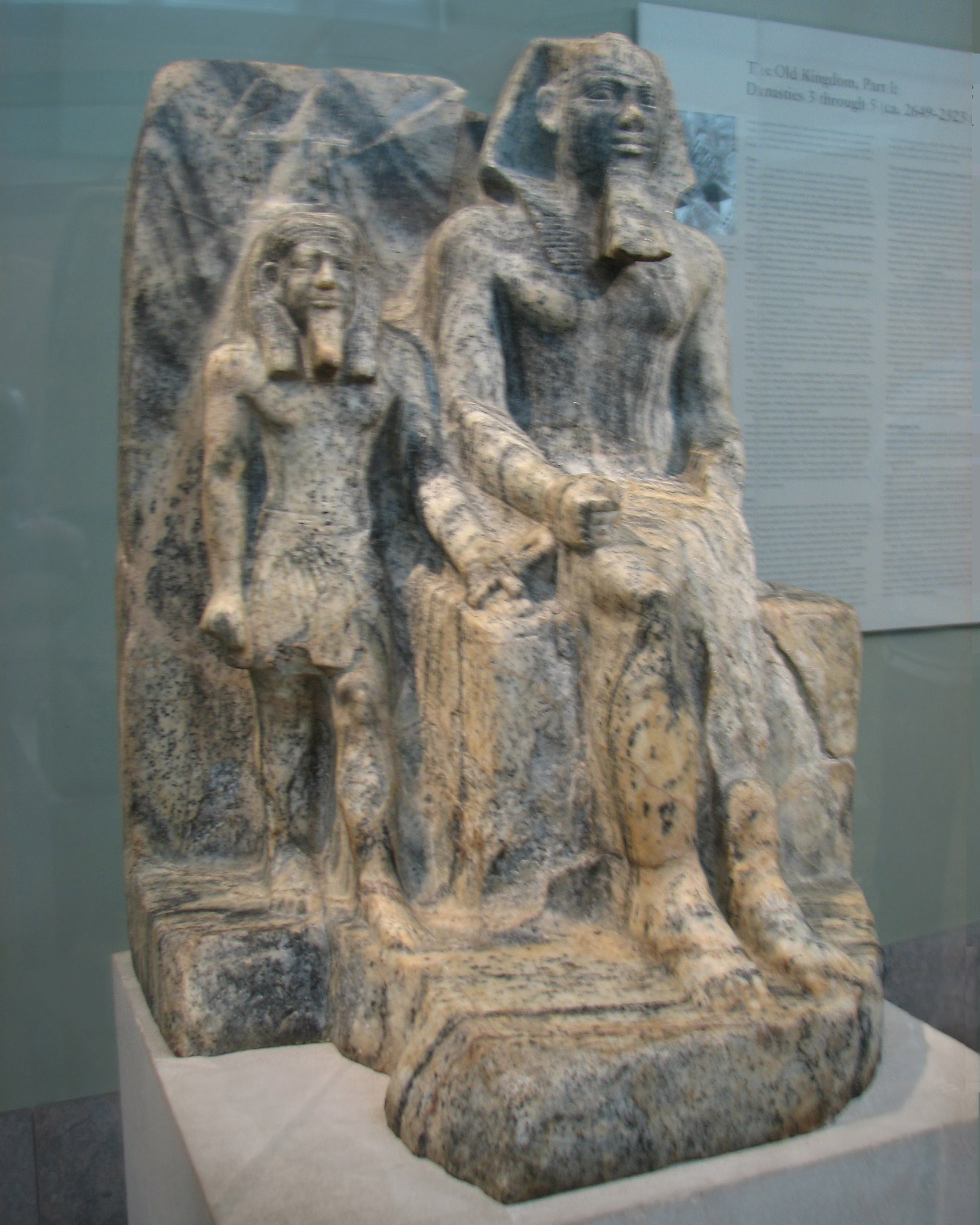 (From info on statue case:) "Sahure, the second pharoah of the Fifth Dynasty, sits on a throne, while, standing next to him, the smaller figure of the god of the Coptite nome (province) extends an ankh (the symbol of life)> The god is named by the symbols carved above his head; the pharoah's names are located on the front of his seat; and on the base are the remains of a speech by the god, promising the monarch the good things of the South. "The statue may have been intended for the pharoah's pyramid complex at Abusir, following the model of King Menkaure of the previous dynasty in which an assemblage of such works represented the gathering of the countries divinities around the pharoah. Alternatively, this could have been a gift to a temple in the Coptitie nome. "The intimacy of the royal figure and the god is expressed through their similar appearance and the god's quiet gesture toward the king."