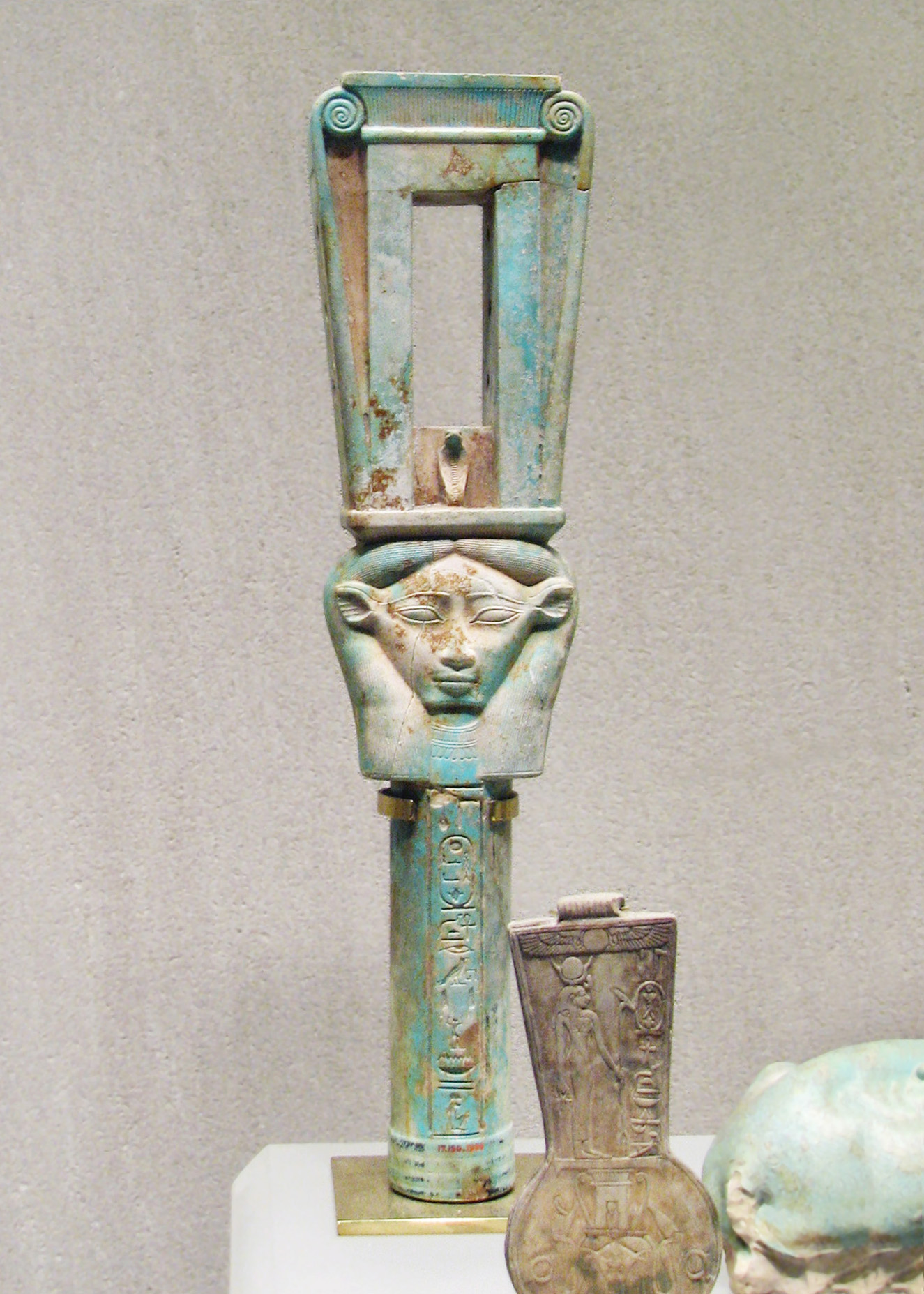 "The faience sistrum and menat on the upper tables both bear the royal name Wahibre, which could be either Psamtik I or Apries. Such items were probably votive offerings donated to temples." (From info card)