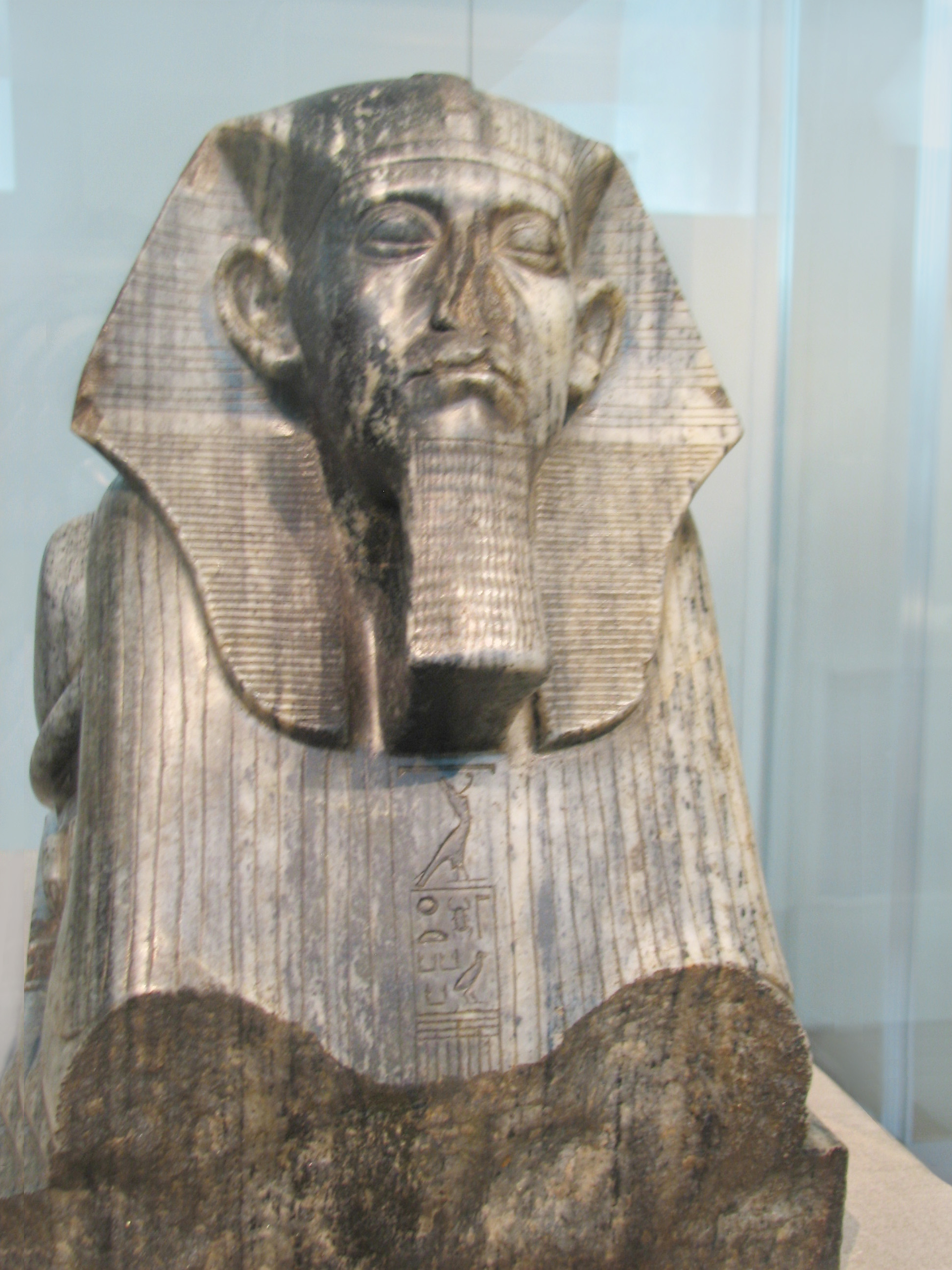 "The crouching feline body of this sphinx, with its royal bull's tail, is remarkable for the way in which the veins of the stone underline the body forms, as if the sculptor wished to negate the boundaries between inert nature and the animal world. The brooding face, on the other hand, is not without allusions to the bestial. the great historian Cyril Aldred has called it the 'haunting portrait of an autocrat.' During the reign of Senwosret III, sculptors freed themselves from the idealism that previously dominated most representations of the pharoah and started to explore without reservations the
