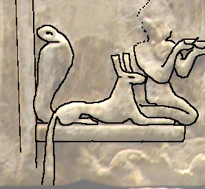West Wall Regarding that symbol: "Osiris also took a cult-symbol from Abdyos which is shown as a decorated box on top of a pole. It is known as the 'Abydene Symbol', but its origin and purpose also remain uncertain, although it came to be acknowledged and worshipped as the embodiment of the god." (From _The Ancient Egyptians_, by Ann Rosalie David, page 109) "On the right, Ramesses, described as "maker of monuments in the Abydene, nome for the lord of continuity, who satisfies the heart of Onnophris with what he has desired", presents offerings to the symbol accompanied by Isis. "On the left, Sety, described as "doer of effective things for Onnophris, caretaker of the Ennead of the Sacred Land," presents a statue of himself offering a jar of myrrh to the symbol accompanied by Horus. In return for the offering, Osiris says to Sety: "My chosen son of my body, lord of Two Lands, Menmaatre, my heart is happy and content because you have acted. You are my son and protector. As long as the sky exists, your deeds will exist."" |