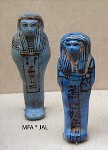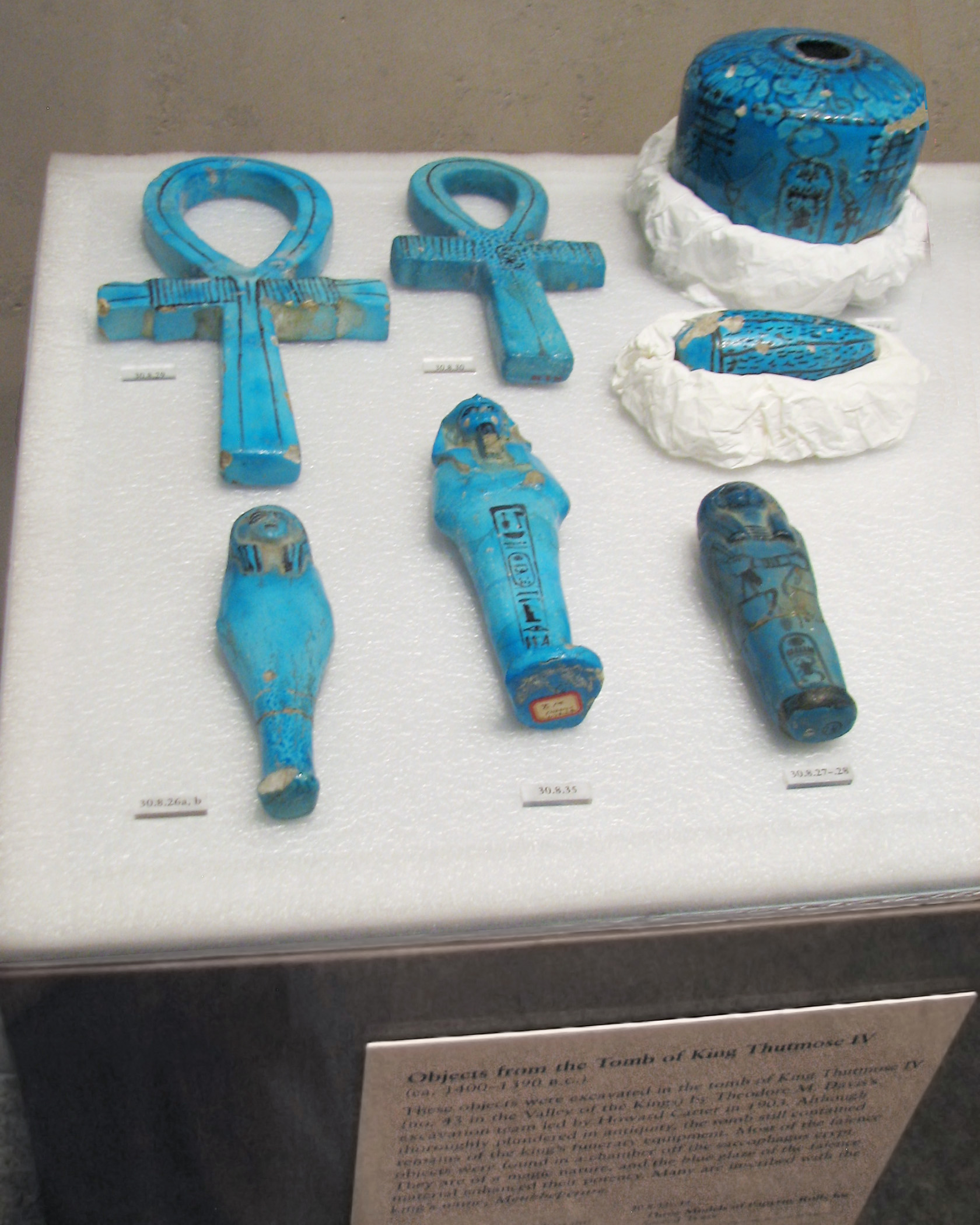 (From info card): "These objects were excavated in the tomb of King Thutmose IV (no. 43 in the Valley of the Kings) by Theodore M. Davis's excavation team led by Howard Carter in 1903. Although thoroughly plundered in antiquity, the tomb still contained remains of the king's funerary equipment. Most of the faience objects were found in a chamber off the sarcophagus crypt. They are of a magic nature, and the blue glaze of the faience material enhanced their potency. Many are inscribed with the king's name, Menkheperura." "The thirty-odd known shabtis of Thutmose IV (KV43) were the first to be equipped with agricultural tools (Davis 1904, 45-57), explicitly adopting the role of servants." (Campbell Price, "Other Tomb Goods", _The Oxford Handbook of The Valley of the Kings_, edited by Richard Wilkinson and Kent Weeks, (Oxford University Press), page 278)