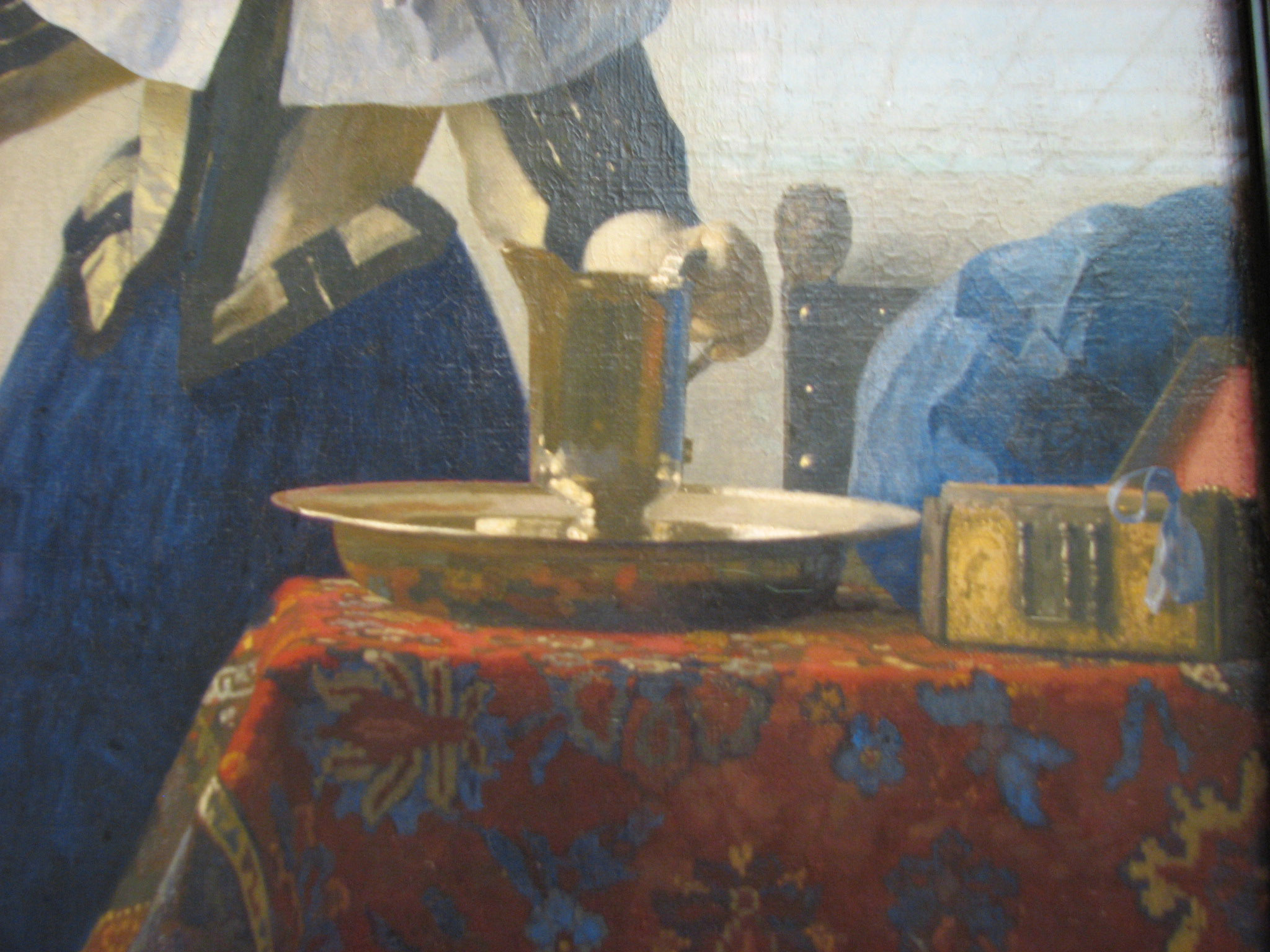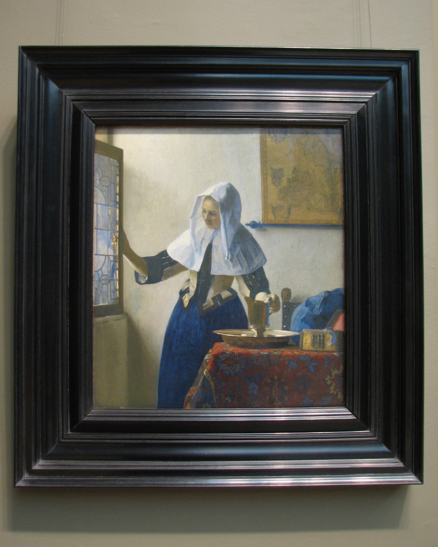 "This well-preserved picture of the early to mid-1660s is characteristic of Vermeer's mature style. Notwithstanding his remarkable interest in optical effects, the artist achieved a quiet balance of primary colors and simple shapes through subtle calculation and some revision during the execution of the work. The composition suits the theme of domestic tranquility, underscored by the basin and pitcher, traditional symbols of purity. This canvas was the first of thirteen paintings by Vermeer to enter the United States between 1887 and 1919."