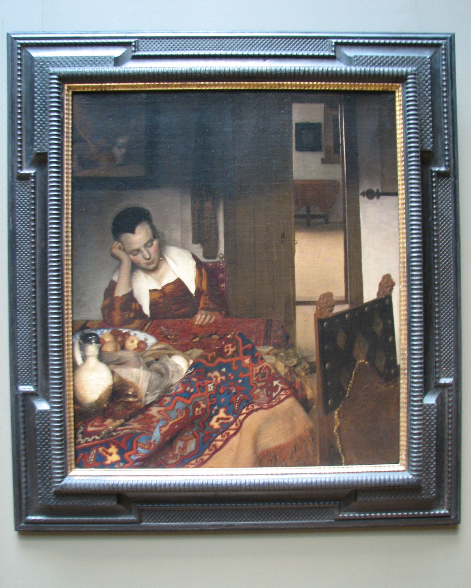 "This canvas of 1656 or 1657 is the earliest work by Vermeer to depict his usual subject of one or two figures in a domestic interior. The wine glass and unsettled objects on the table suggest that some social occasion has passed. To the upper left, the corner of a painting of Cupid (known from other pictures by Vermeer) includes a fallen mask which refers to the woman's unguarded expression. Radiographs reveal that Vermeer originally included a man in the background and a dog in the doorway; these motifs were replaced by the distant mirror and the chair with a pillow to the lower right. In changing the composition Vermeer made its amorous theme less obvious, just as his remarkable passages of observation obscure his borrowing of ideas from other genre painters, such as Nicolaes Maes."