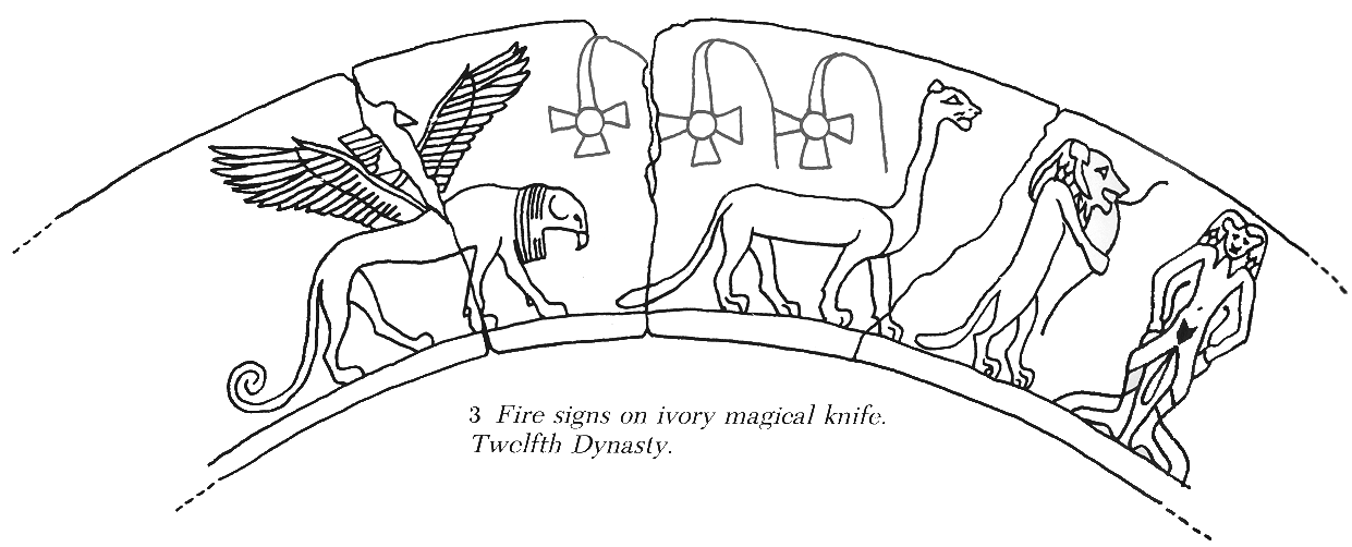 From info card: "These instruments of defensive magic were used to protect mother and child by marking off barriers around a bed or by symbolically cutting off the heads of household dangers, such as snakes and scorpions. The images of animals and demons to ward of illness, accident, and evil forces include Taweret and Bes, protectors of pregnant women and children." I found a linear detail of this wand in Wilkinson's _Reading Egyptian Art_: |