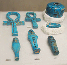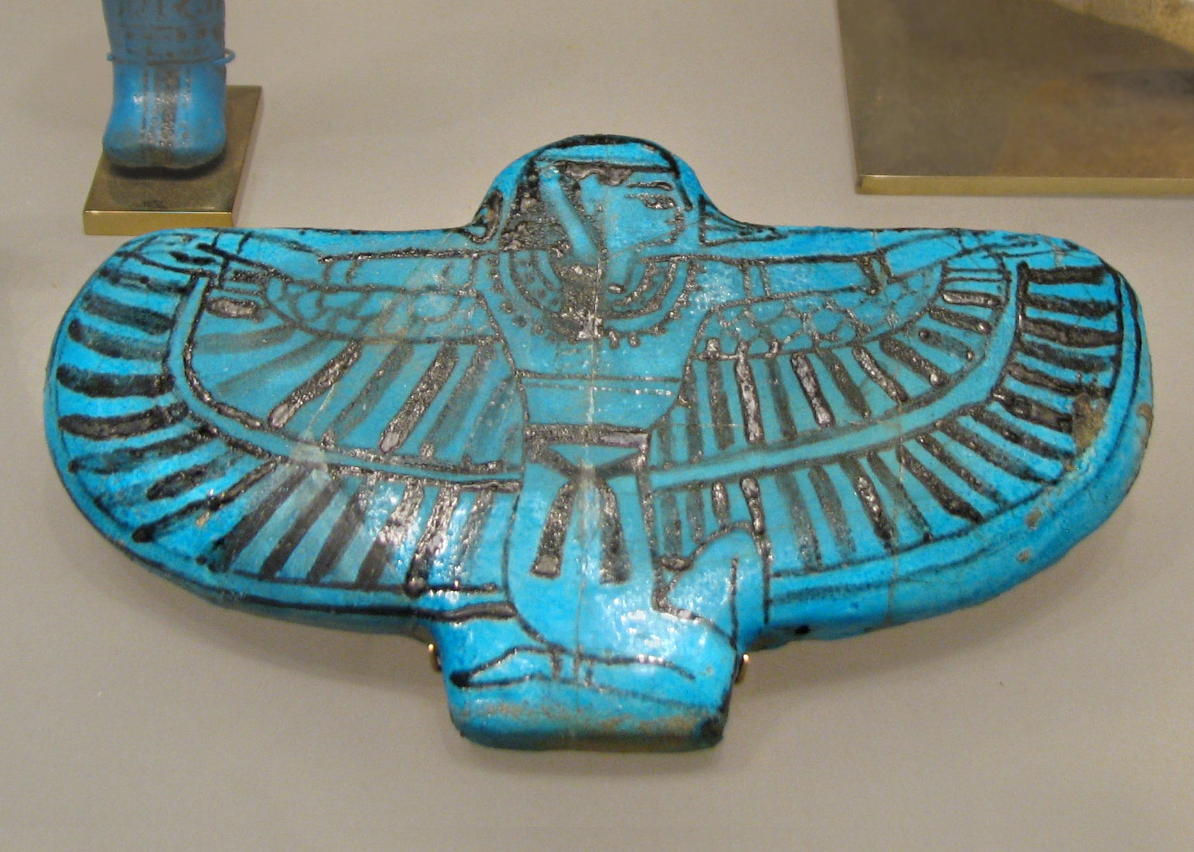 ![]() The winged goddess is "a faience plaque of the goddess Nut from the wrappings of a mummy" Egypt, Upper Egypt; Thebes, Deir el-Medina (Deir el-Medineh), IFAO Tomb 1437, Bruyère New Kingdom, Ramesside, Dynasty 19, (ca. 1295–1185 B.C.E.) Faience and blue glaze, W. 19.5 cm (7 11/16 in) MMA 1974.192, Rogers Fund, 1972 |
