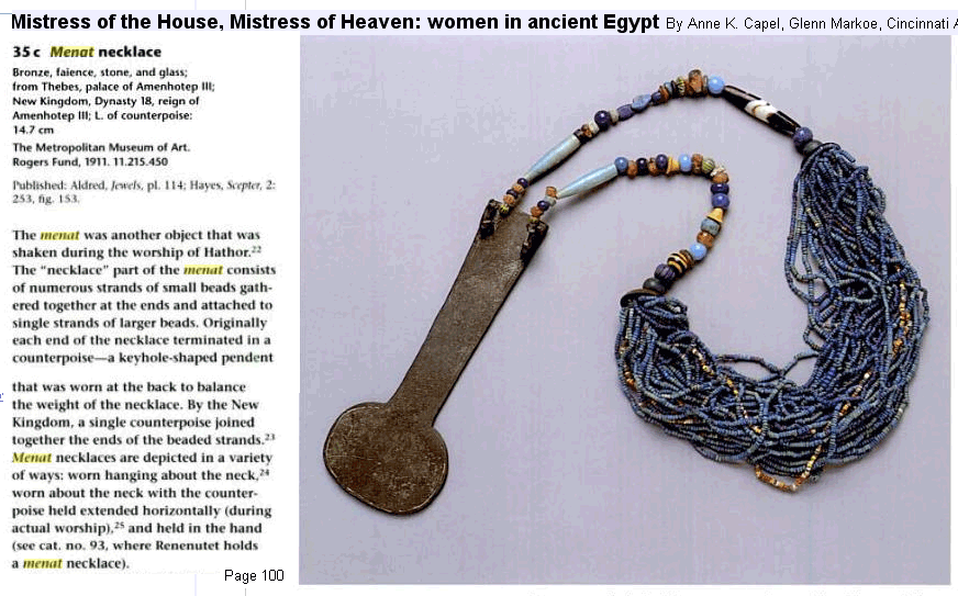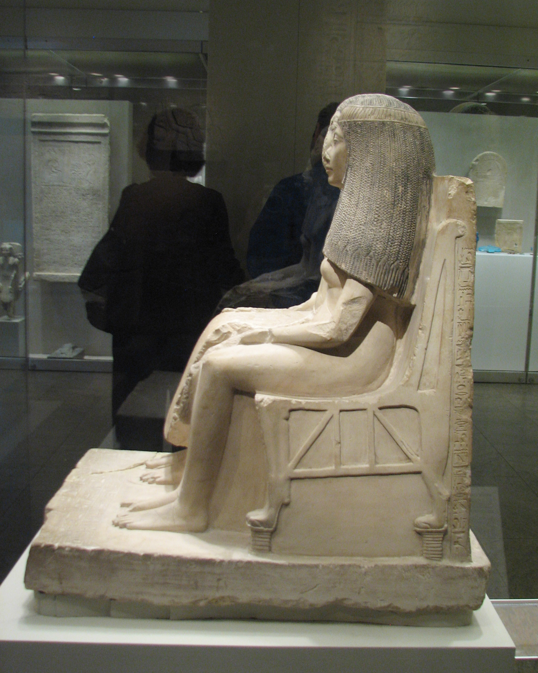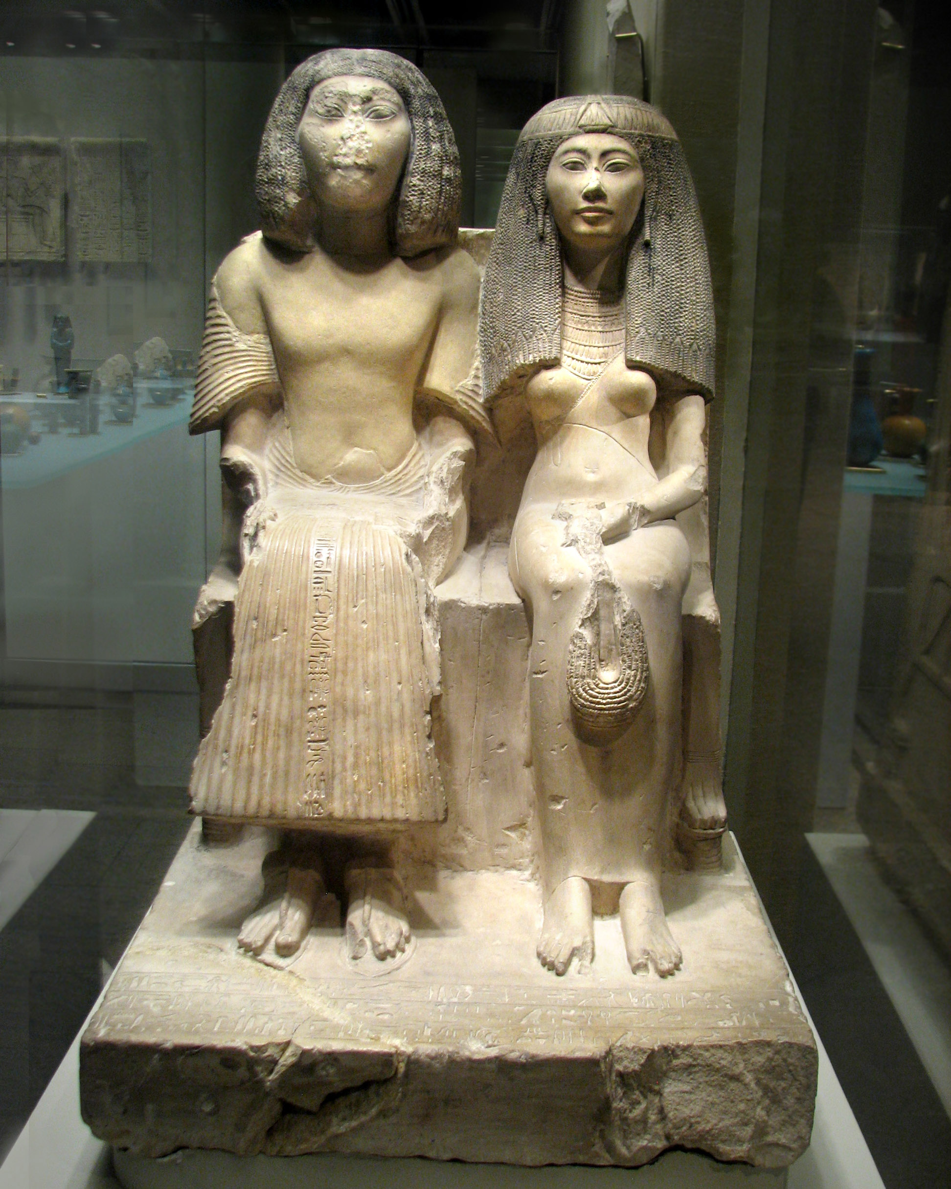 (From the info card) "Yuny and his wife, Renenutet, the subjects of this pair statue, were members of Egypt's nobility. Yuny held a number of supervisory titles, several of which associate him with medical personnel of a temple in the Asyut region. Renenutet's titles indicate that she served in local temples as well. The menat necklace, a percussion instrument held in her left hand, was used during religious rituals and reinforces Renenutet's connection to a local temple dedicated to Hathor. "The sculptor has done an exceptional job of carving the details that convey to the viewer the elaborate clothing, coiffures, and jewelry worn by the Ramesside nobility. In the upper register of the chair's back, Yuny and Renenutet sit in front of a laden offering table while receiving a libation from a priest. Below, Renenutet offers a libation to her parents, Metjay and Yia. The presence of her parents among the decorative scenes suggests that Renenutet, not Yuny, may have commissioned this piece. Since the statue was found in the tomb of Yuny's father, Amenhotep, we know that at least two generations and two families were venerated within the single tomb."
