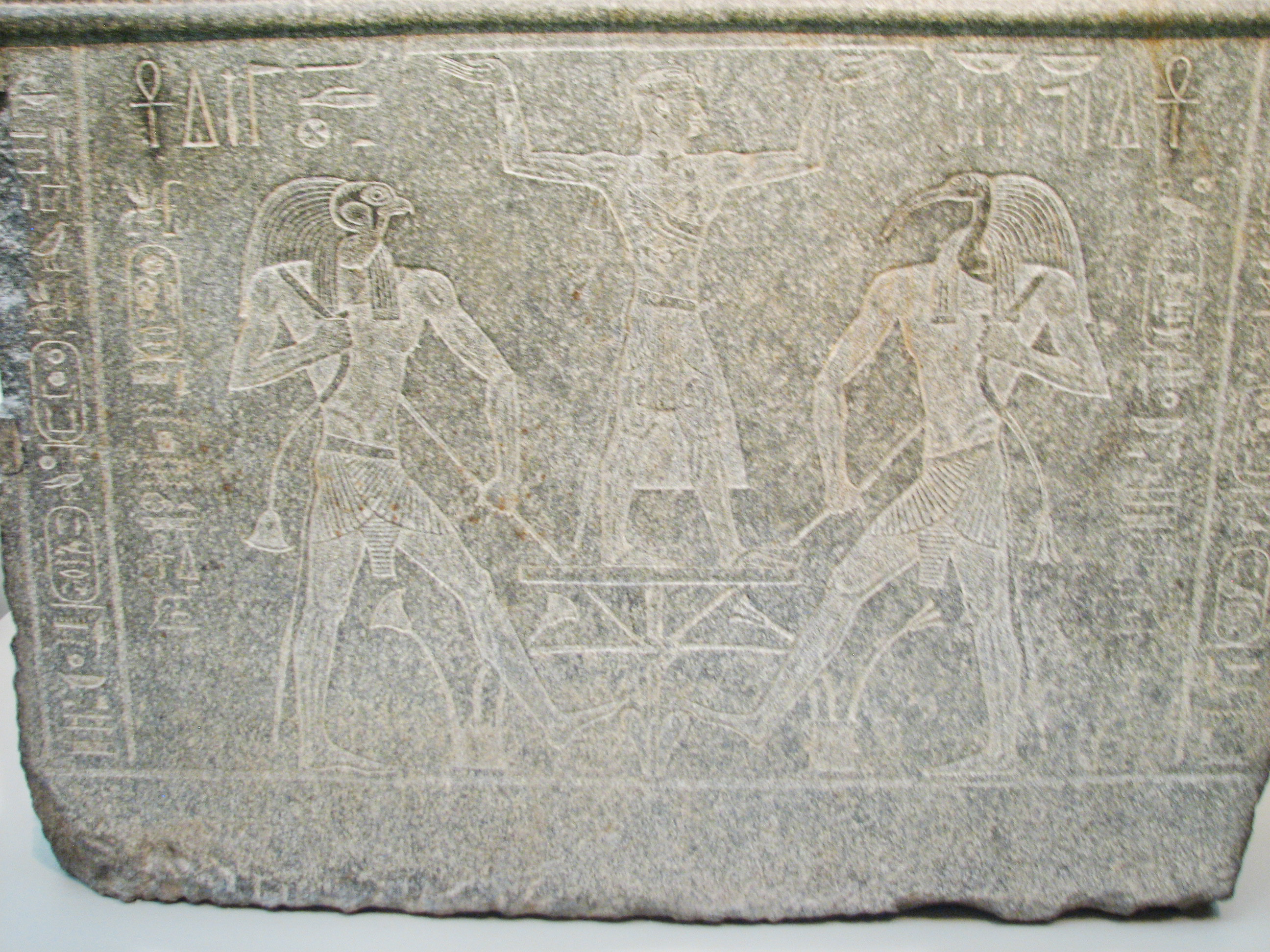 "On the front, two gods tie together the papyrus and lily plants that represnt the union of Upper and Lower Egypt. Two goddesses flank Atlanersa on the back." (From info card.)