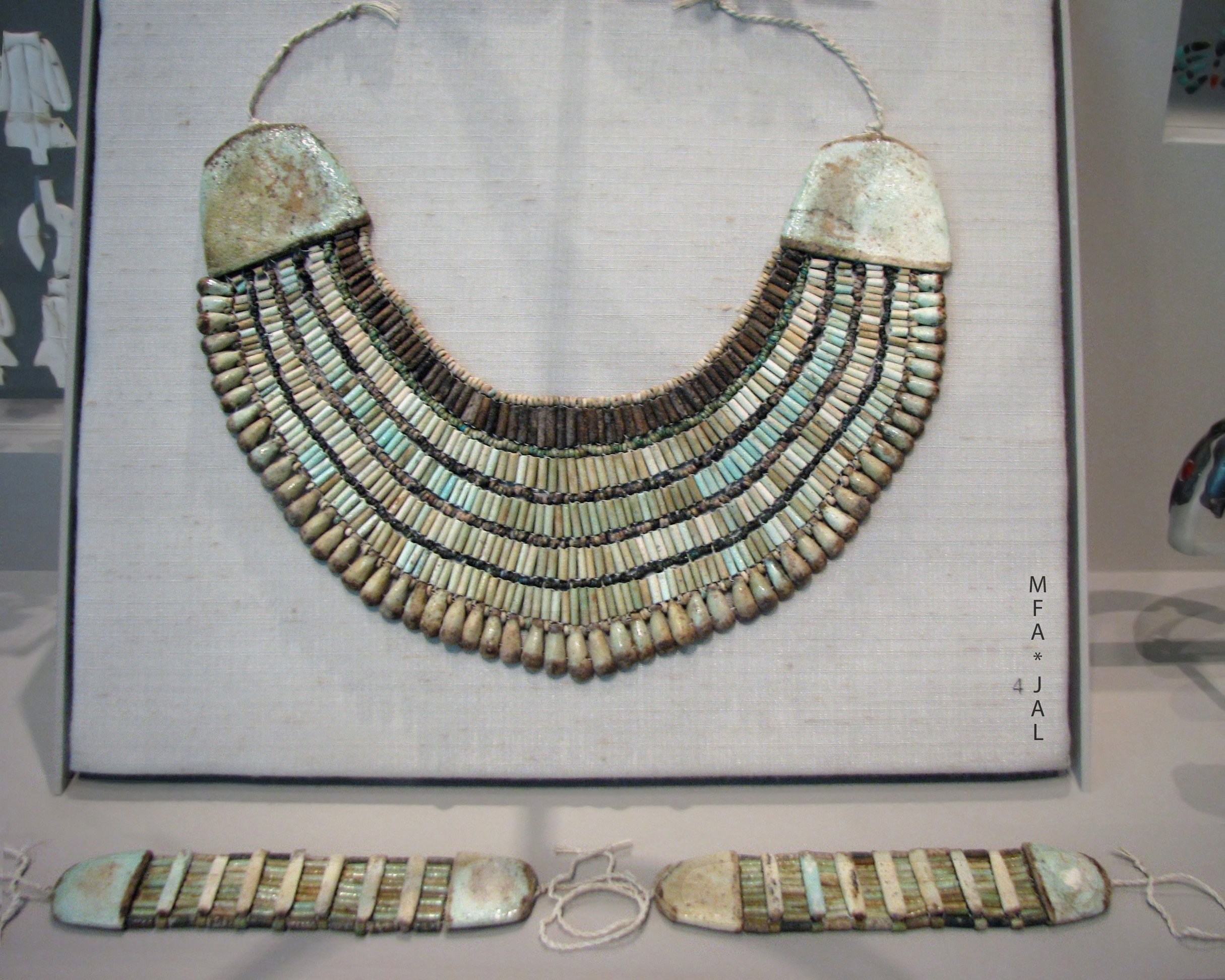 ![]() Polychrome Faience, from Giza, tombs G 2422 D, G 2416 D III and G 1102 F Old Kingdom, Dyn. 5, 2465–2323 B.C.E. Harvard University—Boston Museum of Fine Arts Expedition 1937 Wesekh broadcollar, MFA #37.1313 H x W x D: 19 x 27 x 0.5 cm (7 1/2 x 10 5/8 x 3/16 in.) Wrist ornaments, MFA #37.1311a-b H x W x D: 10.8 x 5.2 x 1.2 cm (4 1/4 x 2 1/16 x 1/2 in.) Photo ©Joan Ann Lansberry, 2014 "The broadcollar was the most common type of Old Kingdom jewelry. At Giza alone, George Reisner found nineteen such collars in tombs of both men and women. In addition, brightly painted broadcollars are represented on statuary and reliefs of deities, royalty, and wealthy private individuals from the Old Kingdom through Roman times. Although jewelry was often made for funerary purposes only, in this case the presence of the counterpoise that served to redistribute the weight of the collar and to ensure that it hung properly suggests that this example was worn in life as well." (From Museum website) |
