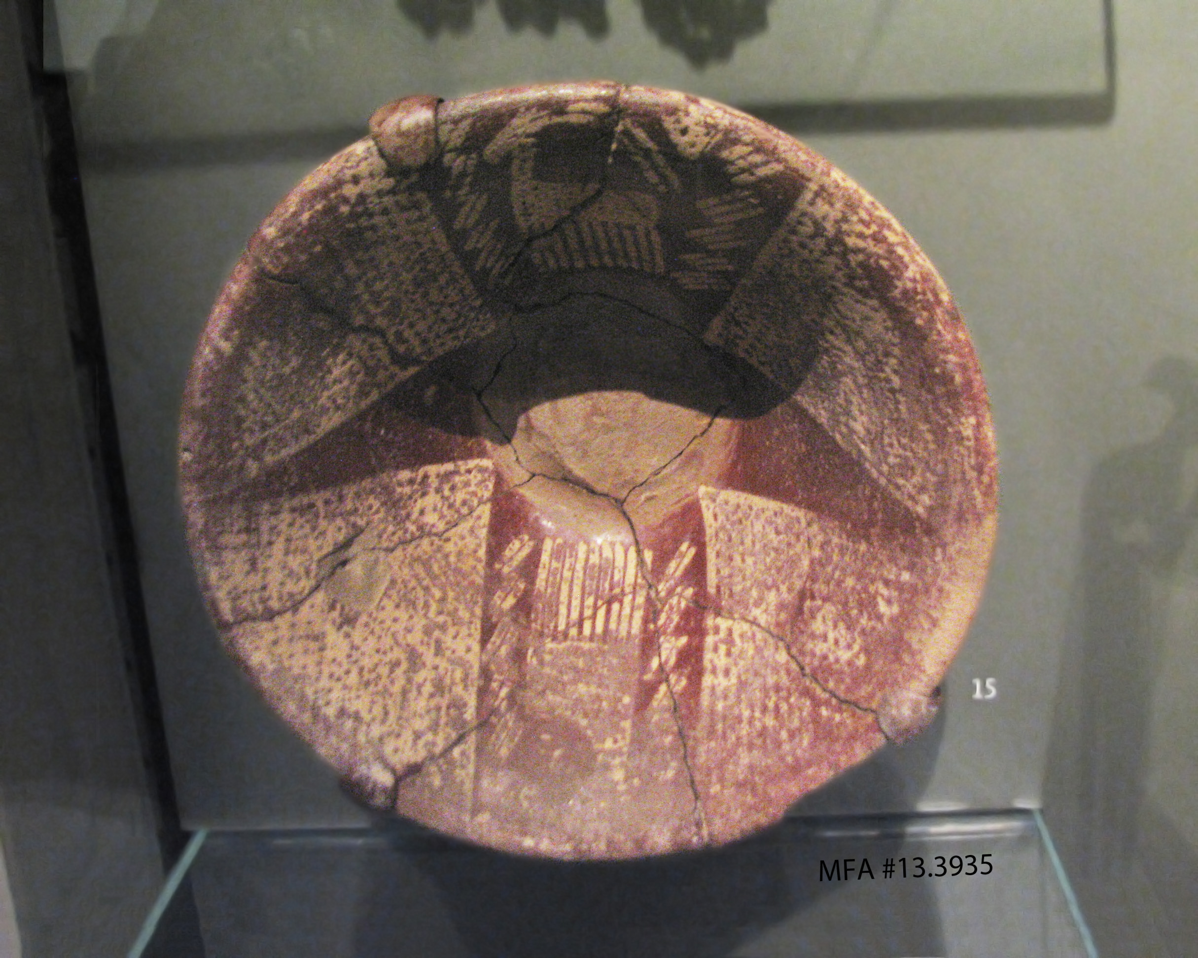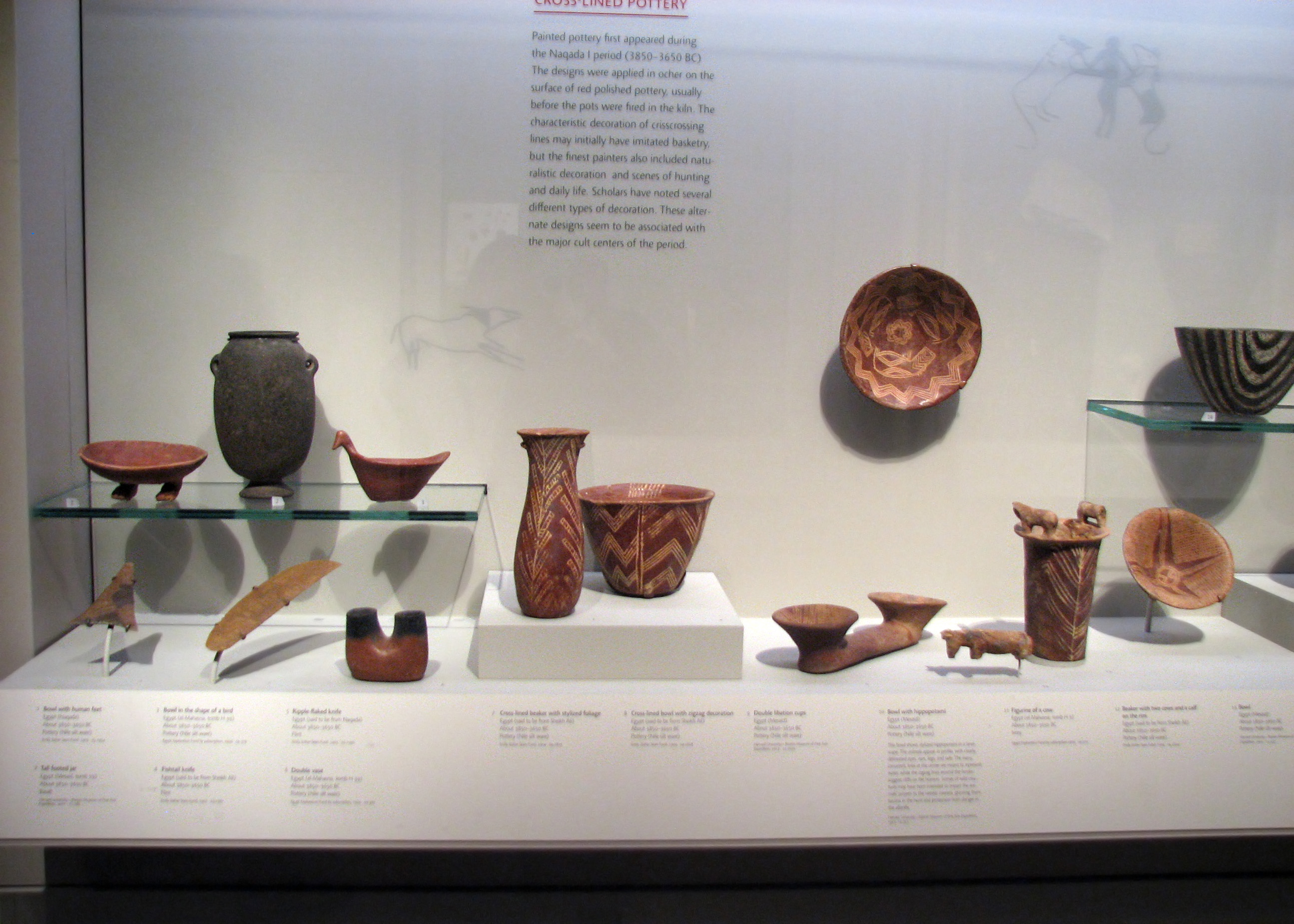 "Painted pottery first appeared during the Naqada I period (3850-3650 BCE). The designs were applied in ocher on the surface of red polished pottery, usually before the pots were fired in the kiln. The characteristic decoration of crisscrossing lines may initially have imitated basketry, but the finest painters also included naturalistic decoration and scenes of hunting and daily life. Scholars have noted several different types of decoration. These alterate designs seem to be associated with the major cult centers of the period." (From the wall display)