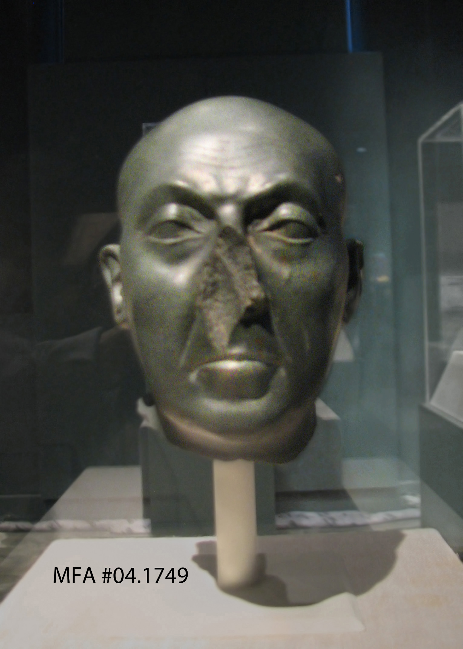 Graywacke, Saqqara, Serapeum, Dyn. 30, 381–343 B.C.E. HxWxD: 10.5 x 8.5 x 11.3 cm (4 1/8 x 3 3/8 x 4 7/16 in.) Purchased of Edward P. Warren Pierce Fund 1904, MFA #04.1749 ?Museum website says "Henry Lillie Pierce Fund"? "This head of a priest, called the Boston Green Head, is one of the finest portraits of antiquity, wonderfully lifelike and individual. Light wavy lines furrow his brow, and crow’s feet radiate from the outer corners of his eyes. The top of his nose has a pronounced bony ridge. Deep creases run from the edges of his nose to the corners of his mouth. Thin lips and a downturned mouth impart an expression of strength and determination. The slight wart on his left cheek is unique in Egyptian art and also introduces an element of asymmetry dear to the artists of the Late Period.