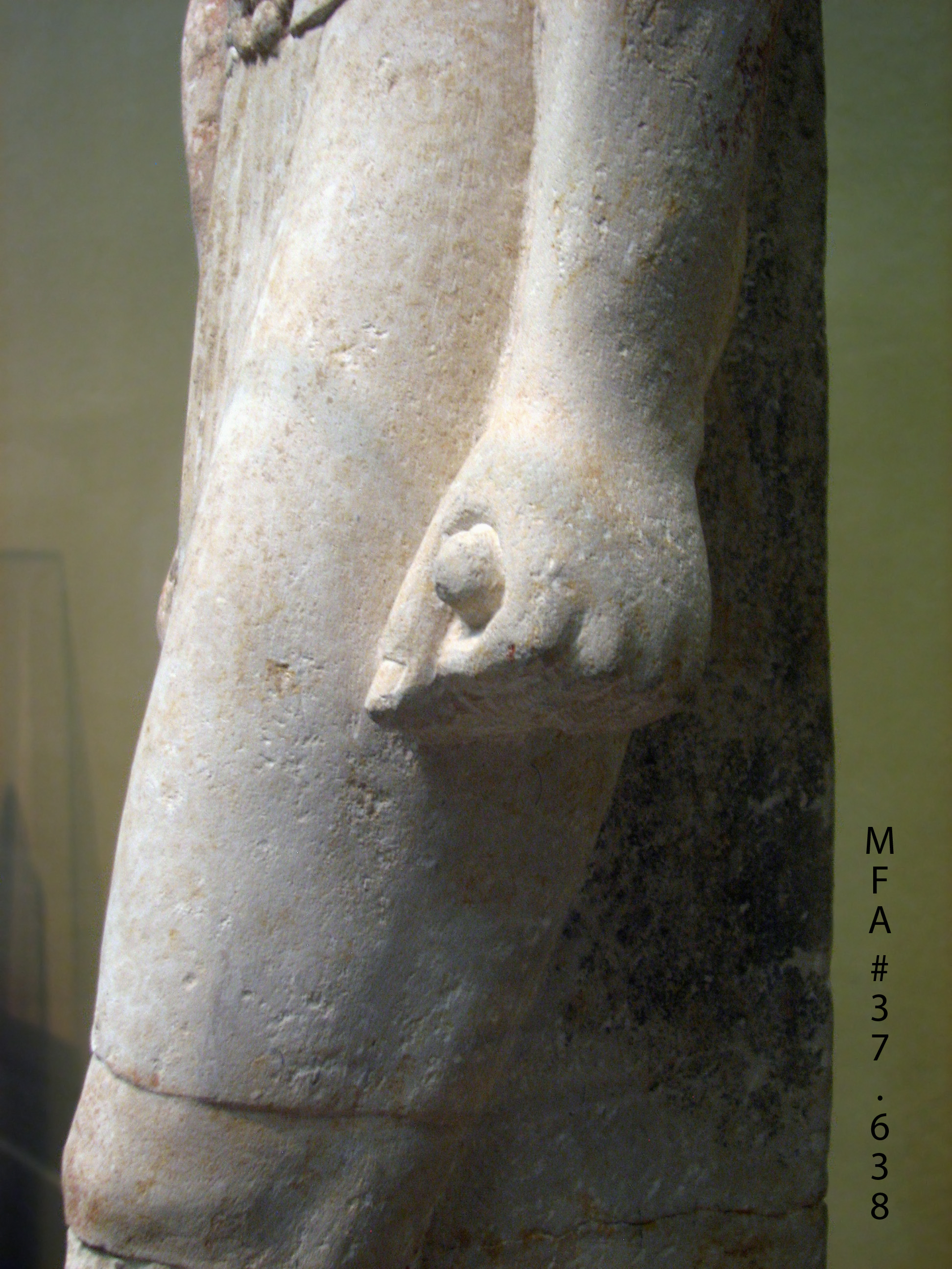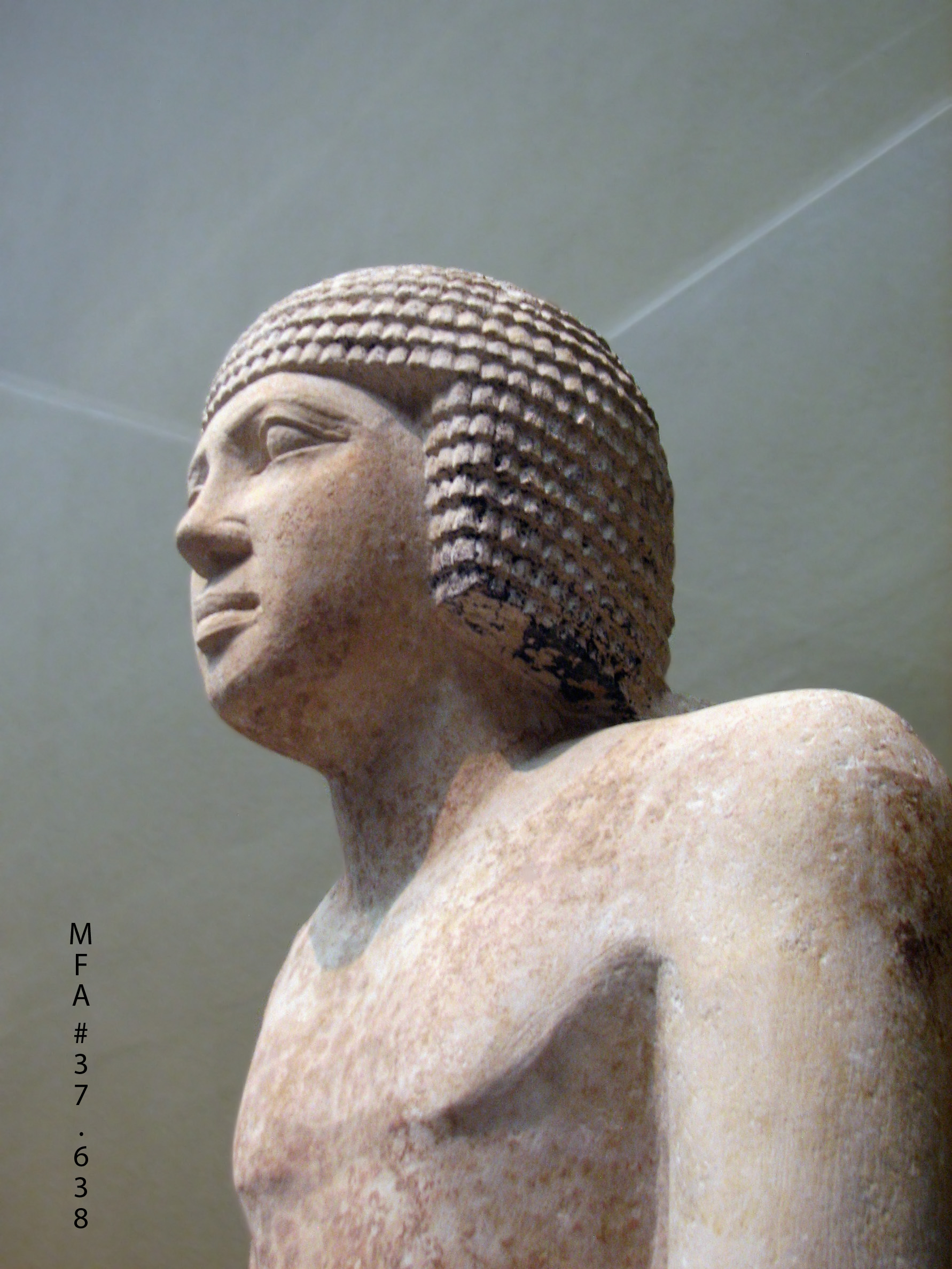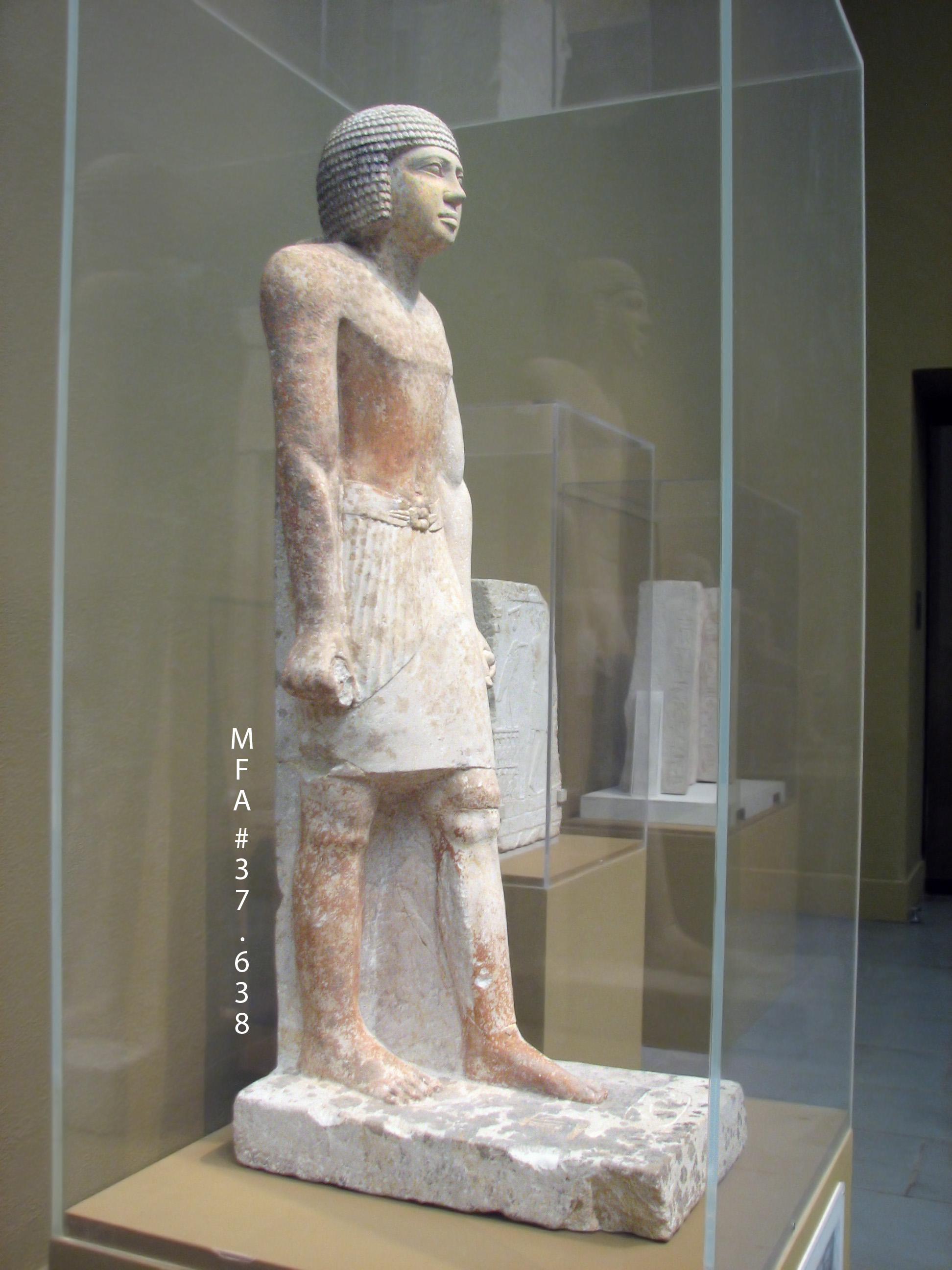 "The subject stands with arms at the side, hands clenched, and left leg advanced--the classic pose for a male figure, which continued through some 3,000 years of Egyptian history. The cylindrical objects held within his clenched fists probably represent folded cloths used as handkerchiefs. The inscription on the base gives his title and name: 'The supervisor of palace attendants, Khuienkhufu (meaning 'one whom Khufu has protected')." (From info card)