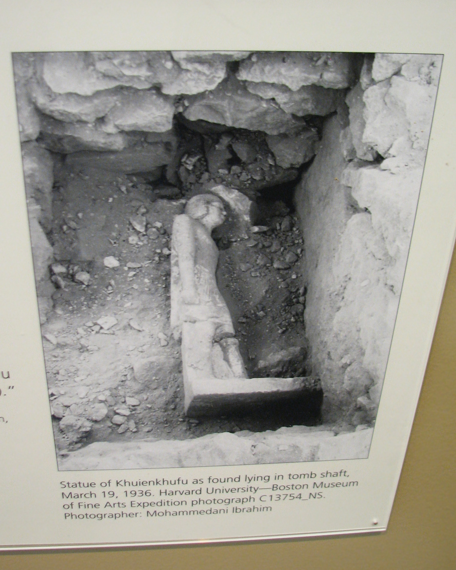 Statue of Khuienkhufu as found lying in tomb shaft, March 19, 1936. Harvard University-Boston Museum of Fine Arts Expedition photograph C13754_NS. Photographer: Mohammedani Ibrahim. (Photographer of Ibrahim's photo: Joan Ann Lansberry)